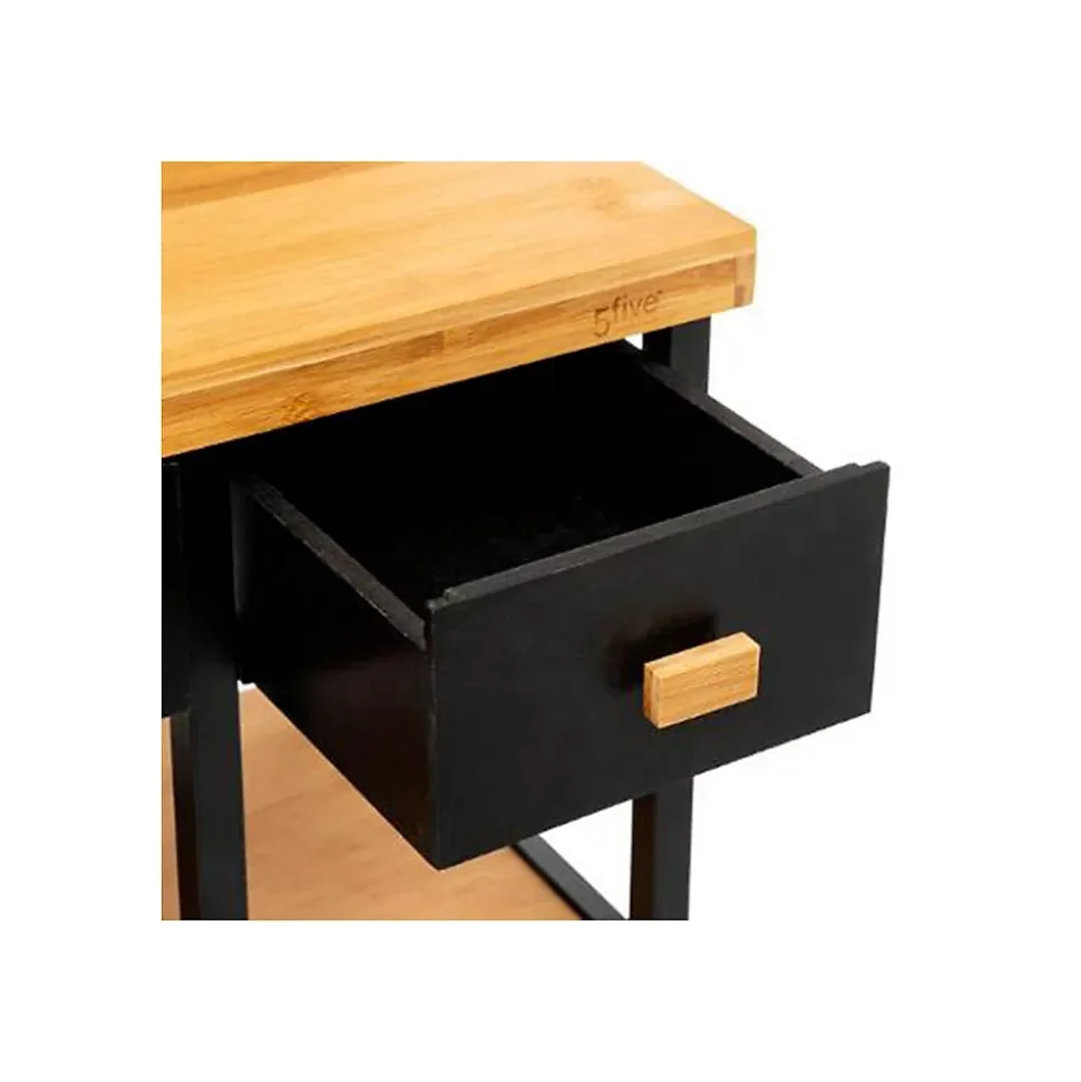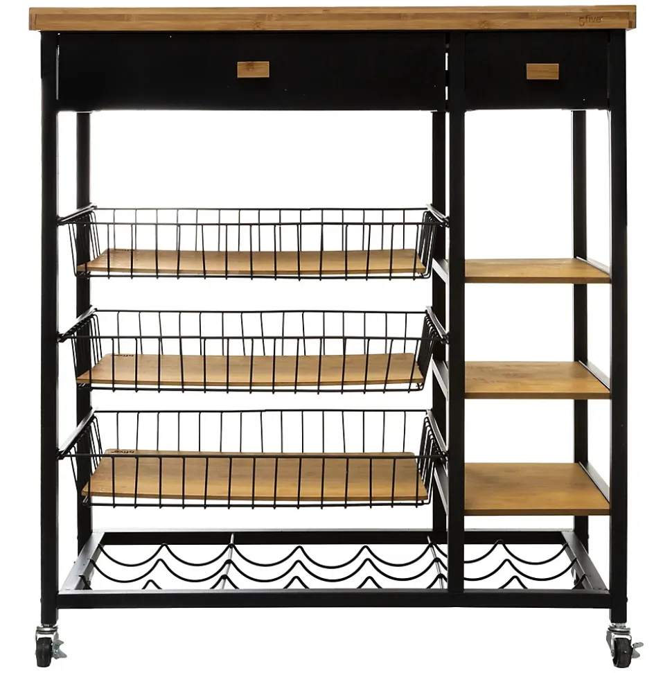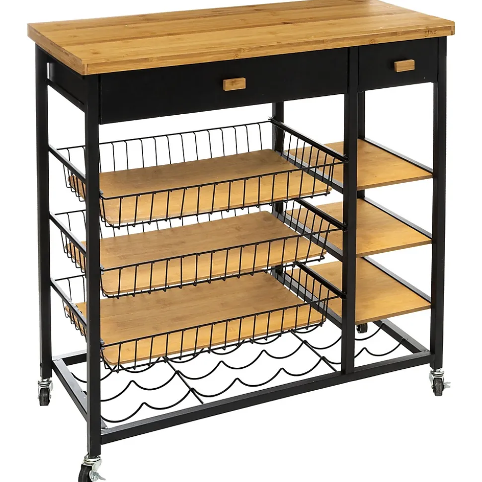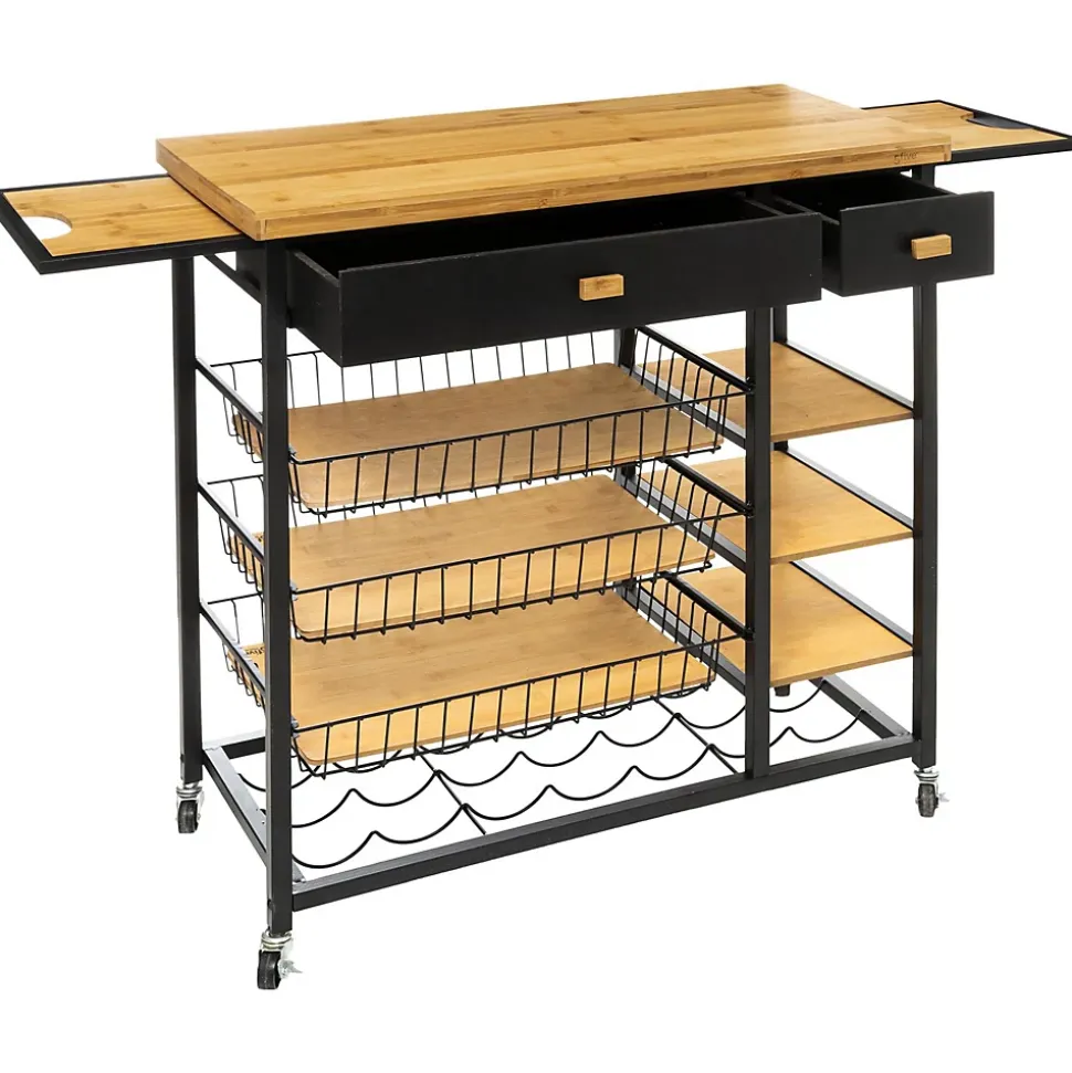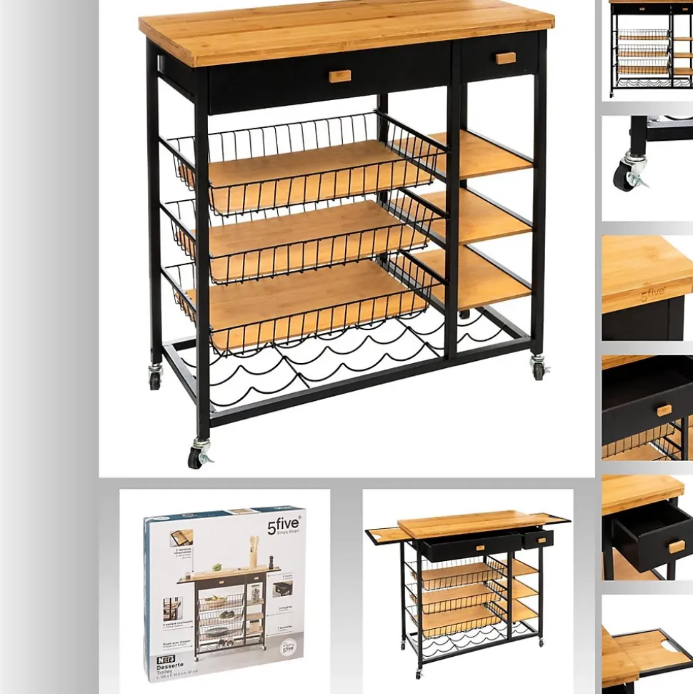 La desserte en métal et bambou de la collection Nera, est l’alliance parfaite entre élégance et praticité. Ses multiples rangements vous faciliteront le quotidien. Elle se déplacera au grès de vos envies, grâce à ses 4 roulettes, qu’il est d’ailleurs possible de bloquer.FICHE TECHNIQUE- Desserte de Cuisine.- Multiple rangements : 3 tablettes + 3 corbeilles.- 2 tiroirs.- Détail : possibilité de ranger 7 bouteilles.- Modèle Nera.- A monter soi-même.- Couleur : Noir et bois clair.- Meuble en Bambou et MDF.- Structure en métal Noir.- 4 roulettes.CARACTERISTIQUES TECHNIQUES- Dimensions : Largeur 126 cm, Hauteur 87 cm, Profondeur 35,50 cm.- Poids : 16,60 Kg.- Dimensions du carton : L. 85,5 x P. 13,5 x H. 82 cm.