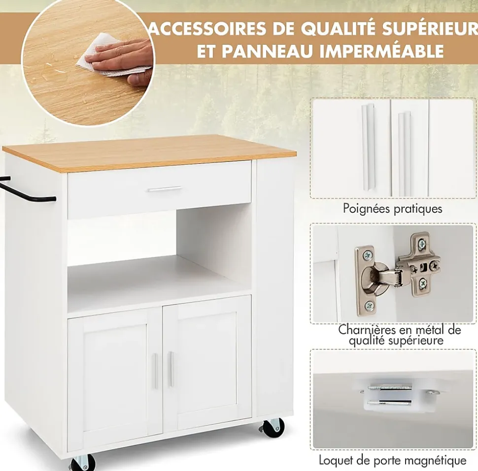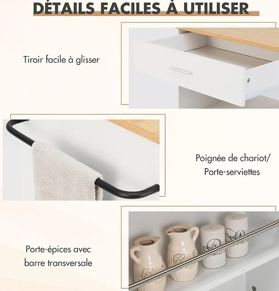 Jetez un coup d’œil à notre chariot! Il est équipé d’un tiroir et d’un placard à double porte, parfaits pour ranger les ustensiles de cuisine. Le grand plan de travail et le porte-épices à trois niveaux sont également très pratiques. Le matériau en bois de haute qualité est robuste et facile à nettoyer. Les poignées métalliques peuvent également être utilisées comme porte-serviettes. Grâce aux roues à frein, ce chariot de cuisine peut être déplacé ou fixé facilement et silencieusement. Grâce à son apparence élégante, ce chariot de cuisine s’intègre parfaitement à divers styles d’intérieur.