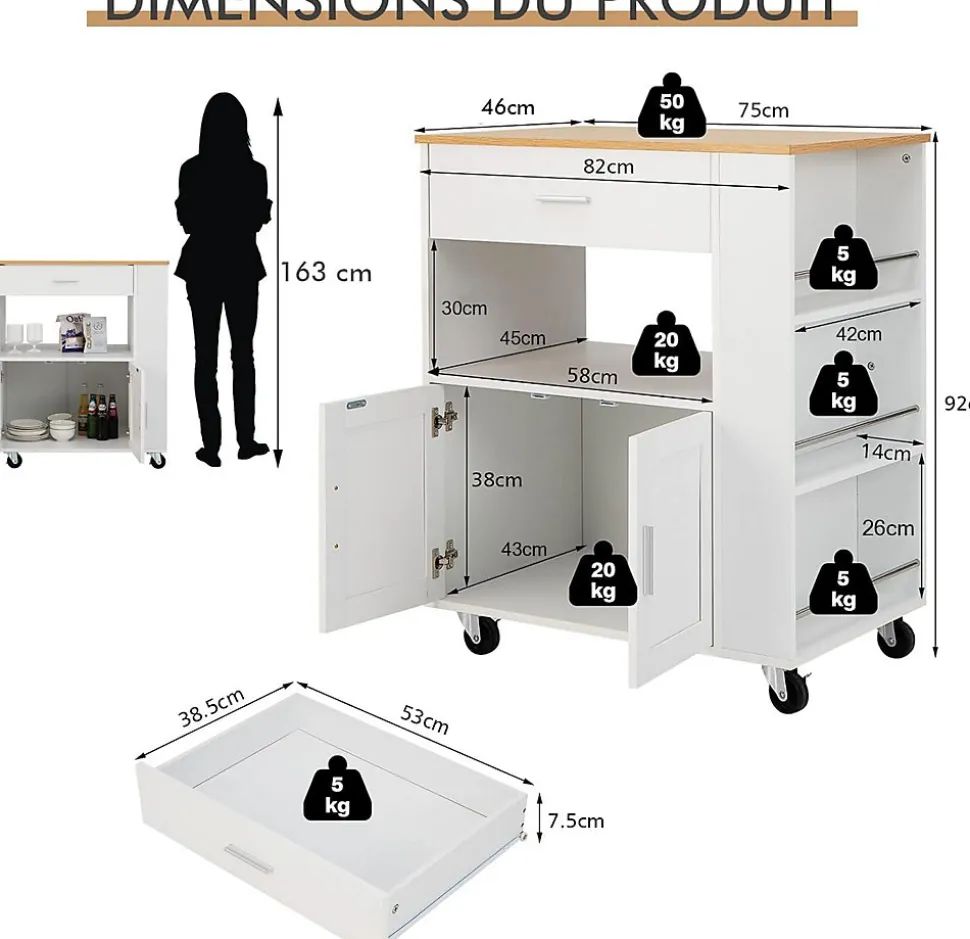 Matériaux: Panneaux de particules, métal, PPDimensions totales: 82 x 50 x 92 cm (L x l x H)Capacité de charge maximale (dessus : 50 kgCapacité de charge maximale(armoire): 20 kgCapacité de charge maximale(étagère ouverte): 20 kgCapacité de charge maximale(tiroir): 5 kgCapacité de charge maximale(étagère latérale): 5 kgPoids net: 26 kgLivraisons :1 x Desserte de cuisine1 x Instructions