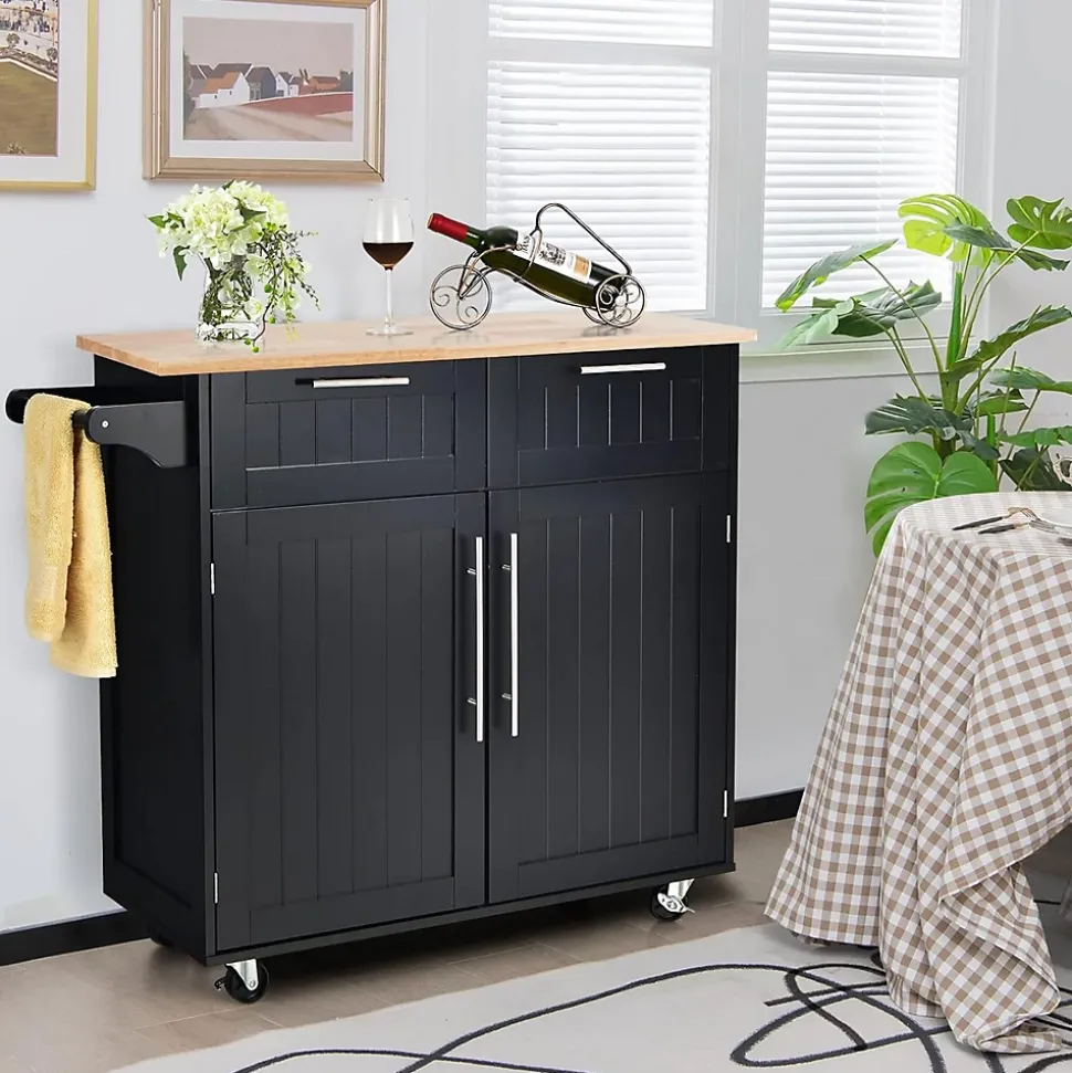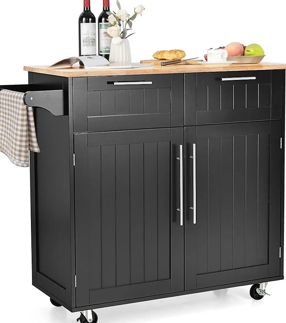 Cet desserte de cuisine comprend un porte-serviettes, des tiroirs spacieux et un espace de rangement fermé avec des étagères. Fabriqué à partir de bois d’hévéa de haute qualité et de matériaux MDF, le chariot de cuisine est robuste et durable. De plus, 4 roues vous aident à déplacer facilement le chariot. 2 des roues avec freins d’urgence vous permettent de le verrouiller en position sans craindre qu’il ne roule. Son élégant plateau en bois améliore son attrait esthétique général, l’installant dans la salle à manger, la cuisine, le bar, le restaurant, etc.