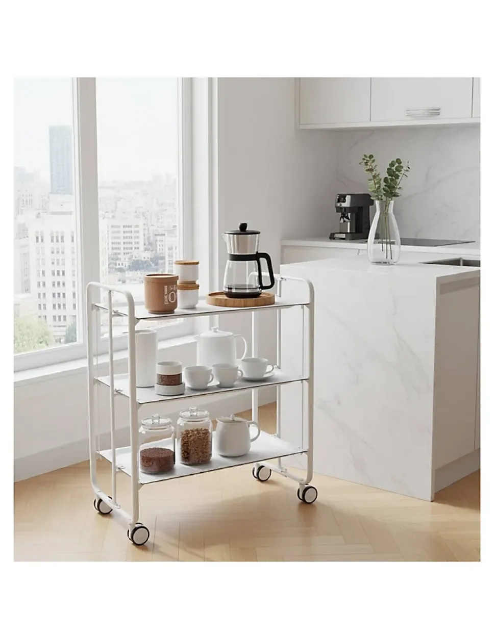 - Sa structure métallique blanche et ses plateaux en stratifié décoratif en font un meuble polyvalent et élégant, idéal pour la cuisine, le salon ou la terrasse.
