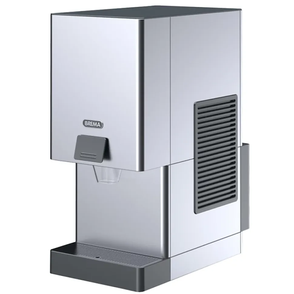 Distributeur automatique de glace nuggets de la marque Brema Distribution automatique de glace NuggetsCondenseur refroidi par air Carrosserie inox AISI 304Circuit frigorifique R-290Fonctionnent en ambiance de +10° à +43°C.Alimentation 230 V (mono) – 50 Hz.
