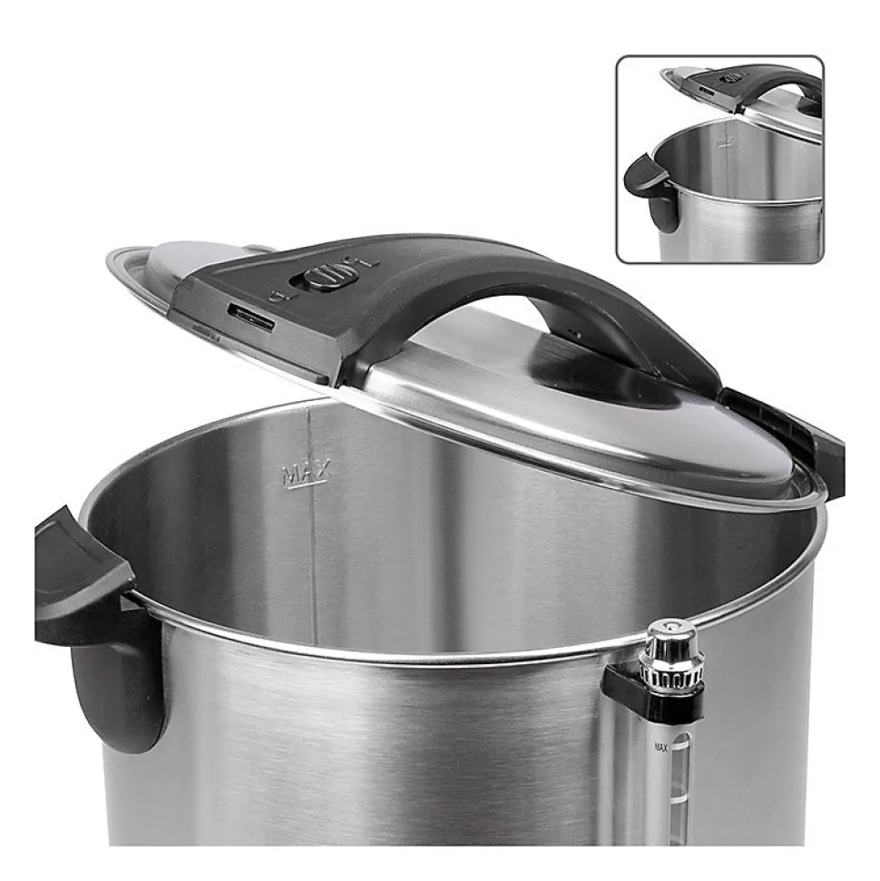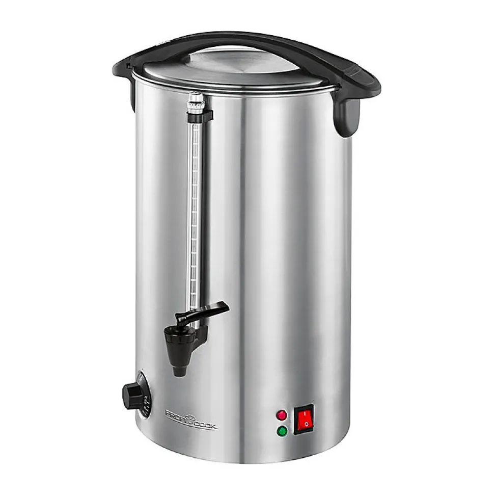 – Machine à boissons chaudes de haute qualité dans un boîtier continu en acier inoxydable- Idéal pour le vin chaud, le thé et le café- Convient également pour garder au chaud ou servir par ex. soupes- Capacité du réservoir de 7 litres (35 tasses à 0,2 litre- 1500 watts- 2 voyants lumineux- Conteneur de sécurité en acier inoxydable verrouillable- Élément chauffant dissimulé en acier inoxydable- Contrôle de température électronique variable (30 ° C – 100 ° C)- Fonction de maintien au chaud- Indicateur de niveau externe- Indicateur de niveau Tap + amovible pour un nettoyage facile- Poignées en plastique (isolées thermiquement)- Interrupteur marche / arrêt (éclairé)- Protection contre la surchauffe- 230 V, 50 Hz, 1500 W