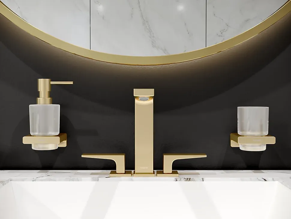 Distributeur de savon liquide couleur or de hansgrohe. L’élégant distributeur de savon liquide AddStoris de hansgrohe permet d’ordonner facilement votre salle de bain. Son réservoir en verre peut contenir environ 200 ml de savon liquide. Lorsque la pompe est actionnée, elle délivre environ 2 ml de produit pour un nettoyage efficace. Son design moderne et minimaliste donne un style distinctif et épuré. Elle s’associera parfaitement avec les mitigeurs de salle de bain géométriques de la gamme Metropol de hansgrohe. Son design sophistiqué va de pair avec la qualité hansgrohe : Confectionné en métal et en verre, le distributeur de savon liquide AddStoris est fait pour durer. Faisant un usage durable des ressources naturelles, ce produit permet de réduire la quantité de plastique dans votre salle de bain. Sa finition de surface en métal brillant de couleur or est facile à nettoyer. De plus, ce coloris est aussi utilisé dans la gamme de finitions de surface spéciales pour mitigeurs de hansgrohe (FinishPlus). Pour que tout soit parfaitement assorti. Installation facile : Ce distributeur de savon liquide se fixe solidement au mur à l’aide de deux vis. L’espacement des trous est de 26 mm. Autres caractéristiques : • Set de montage robuste avec élément de fixation en métal. • Fixation invisible pour plus d’harmonie. • Matériel de montage fourni. • Qualité de marque hansgrohe : les pièces détachées sont disponibles jusqu’à 15 ans après arrêt de la gamme.