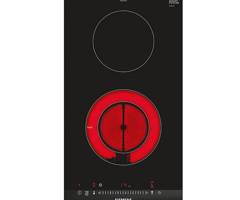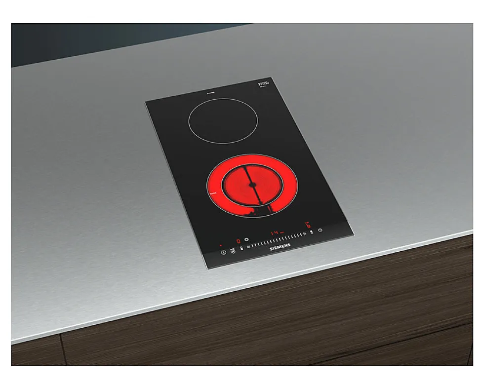 Domino vitrocéramique 30cm 3500w Siemens – Table de cuisson SIEMENS ET375FFP1E.Le domino vitrocéramique pour cuisiner en toute sérénité et nettoyer en toute simplicité.Le domino de 30 cm de large est idéal pour personnaliser son plan de travail en l’associant à un autre domino ou une table classique avec profil inox sur les côtés.Grâce au touchSlider, la température peut être activée et contrôlée directement d’une simple pression ou d’un glissement du doigt.Grâce à la minuterie avec coupure automatique, la zone de cuisson se coupe automatiquement lorsque le temps de cuisson est écoulé.Design :Affichage digitalCommande touchSliderPuissance :2 zones highSpeed dont 1 foyer halogèneAvant 120 mm, 180 mm : 1 kW, 2 kWArrière 145 mm : Foyer normal 1.2 kW.Confort/Sécurité :Fonction Re-Start : en cas d’arrêt brutal de la table, mémorisation de la température initiale pendant 4 secondesAffichage de la consommation énergétique17 positions de réglageFonction powerBoostTimer sur chaque foyerTémoin de chaleur résiduelle à 2 niveauxTouche nettoyage : possibilité de bloquer le bandeau de commande pendant 20 secondes afin de nettoyer la table en cas de débordement – Pose-libre / Intégré : Intégrable.Type de commandes : Electronique.Système de commandes : a l’avant, Commande touchSlider.Type d’énergie : Électrique.Energy consumption of hob : 192.0.Combien de foyers peuvent-ils être utilisés simultanément : 2.Nombre de brûleurs : 0.Nombre de foyer (s) électrique (s) : 2.Nombre de plaques fonte : 0.Nombre de foyers radiants : 2.Nombre de foyers halogènes : 0.Emplacement du bandeau de commande : Devant.Matériau de base de la surface : Vitrocéramique.Couleur de l’appareil : Noir.Couleur de la surface : Acier inox, Noir.Type de cadre : Facette/Profilés.Couleur du cadre : Acier inox.Puissance maximum de raccordement électrique (W) : 3500.Intensité (A) : 13.Tension (V) : 220-240.Fréquence
