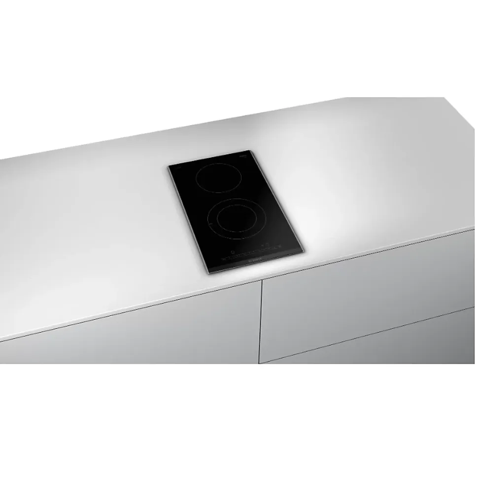 Domino vitrocéramique 30cm noir Bosch – Domino vitrocéramique Série 6 PKF375FP2E de bosch rend la cuisine et le nettoyage plus facile. DirectSelect : accès direct à la zone de cuisson désirée, aux puissances et autres fonctions additionnelles. Comfort-design : design élégant et séduisant avec facettes inox latérales et face avant biseautée. Domino fonctionnel de 30 cm de large. PowerBoost : votre plaque électrique fournit jusqu’à 20 % d’énergie en plus. Timer avec fonction arrêt : désactive la zone de cuisson selectionnée une fois le temps programmé arrivé à échéance. – Type de produit : Domino vitrocéramique.Pose-libre / Intégré : Encastrable.Source d’énergie : Électricité.Nombre de foyers pouvant être utilisés simultanément : 2.Témoin de chaleur résiduelle : Indépendant.Emplacement du bandeau de commande : Devant de la table.Matériau de base de la surface : Vitrocéramique.Couleur de la surface : Alu., brossé, Noir.Longueur du cordon électrique : 100 cm.Puissance maximum de raccordement : 3500 W.Intensité : 16 A.Tension : 220-240 V.Fréquence : 50, 60 Hz.Sécurité enfants.Sécurité surchauffe.Système de commande : Bandeau DirectSelect.Zone de cuisson flexible : Two-ring cooking zone.Minuterie : Oui.Positions de réglage de la zone chauffe-plat : 17 positions de réglage .Câble de raccordement : 1 m.Taille de niche requise pour l’installation (HxLxP mm) : 38 x 270 x (490 – 500).Dimensions du produit (HxLxP mm) : 38 x 306 x 527.Poids net : 4,5 kg.