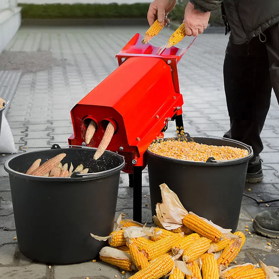 - SUPPORT: Le support pratique surélève l’égreneuse à maïs électrique. Il est ainsi possible d’introduire des épis de maïs en position debout et de placer des bacs de récupération sous les éjecteurs. Il y a deux goulottes, une pour les grains de maïs et une pour les épis de maïs
