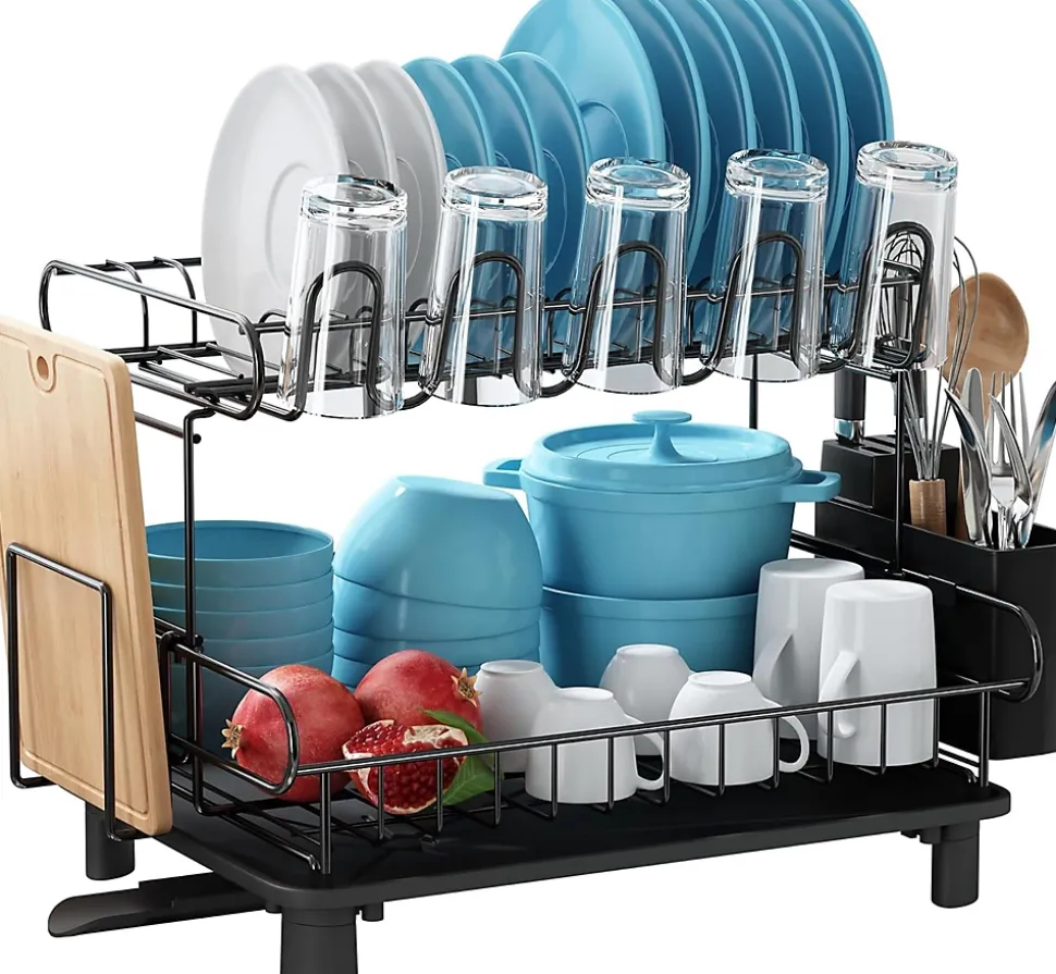 Permet d’économiser 80 % de l’espace – Nos séchoirs à vaisselle doubles et leurs accessoires prennent moins de place sur votre plan de travail, tout en pouvant contenir plus de vaisselle qu’un séchoir à vaisselle classique. Il est très spacieux et peut contenir une grande variété d’articles de cuisine.Drainage pivotant à 270° et télescopique – Notre égouttoir à vaisselle est équipé d’un plateau d’égouttage automatique qui vous évite de verser manuellement de l’eau tous les jours, ce qui est plus pratique et plus simple ! Le bec pivotant innovant tourne à 270° et se télescope pour permettre à l’eau de s’écouler directement dans l’évier, évitant ainsi de mouiller le plan de travail.Porte-Vaisselle Robuste et Durable – Nos supports à vaisselle sont fabriqués en acier inoxydable épais et durable. Haute résistance, pas de déformation, protection de l’environnement, sécurité et durabilité. Trois couches de nano-revêtement, adieu la rouille, pas de perte de peinture, pas de décoloration, résistance à la corrosion. Le support de vaisselle est lisse et résistant aux rayures pour éviter de se blesser les mains ou de rayer les tasses.Facile à Installer et à Nettoyer – Le support à vaisselle pour comptoir de cuisine est simple dans sa structure et facile à installer. Aucun outil n’est nécessaire pour l’installation, il suffit de les assembler. Vous pouvez facilement le nettoyer en le rinçant sous le robinet. L’égouttoir à vaisselle est robuste et durable et peut supporter jusqu’à 110 kg.