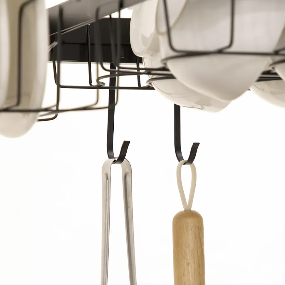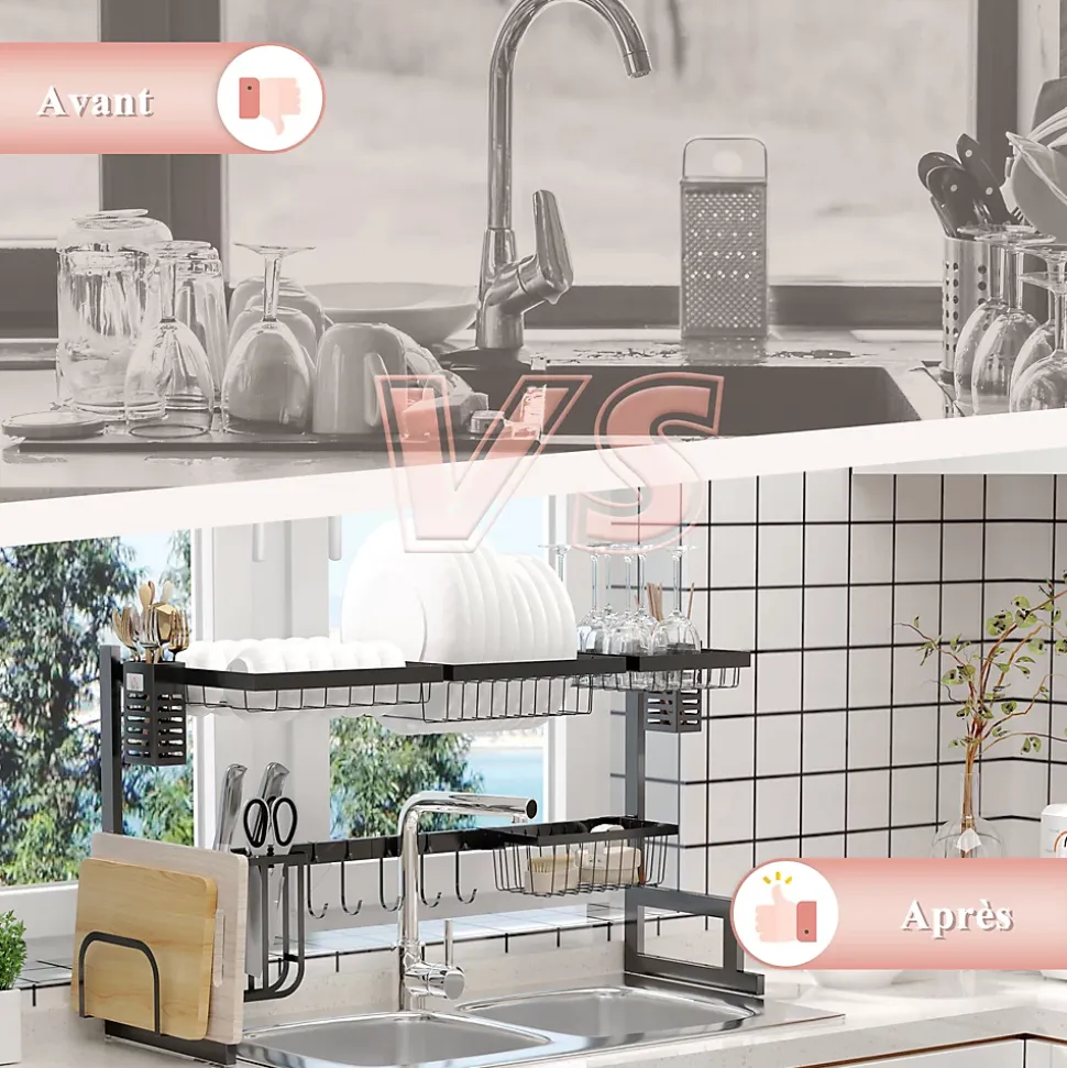 Cet égouttoir organisateur va vite devenir un essentiel de votre cuisine. On aime le design sobre et minimaliste de cet égouttoir organisateur de cuisine en métal noir. Il apportera de l’élégance dans toutes les cuisines. Grâce à ses 2 niveaux et ses nombreux rangements modulaires, il s’adaptera parfaitement à vos besoins. Il est spacieux et robuste et vous pouvez y déposer vos ustensiles quotidiens : plats, bols, couteaux, planche à découper, etc. plutôt que de les éparpiller sur votre plan de travail. Un organisateur indispensable pour votre cuisine !Caractéristiques :- Grande capacité, convient pour les familles de 4 personnes ou plus- Comprend un porte-bol, un porte-assiette, un panier à fruits, deux porte-ustensiles, un porte-détergent, un porte-couteau, cinq crochets et un porte-planche à découper pour garder vos ustensiles organisés- Espaces agrandis accélèrant le séchage en offrant un flux d’air optimal et ainsi empêchant la prolifération des bactéries- Fabriqué en acier inoxydable et résistant aux rayures pour supporter jusqu’à 23 Kg- Pieds revêtus de ventouses antidérapantes évitant à l’article de glisser de votre plan de travail- Montage facile à l’aide du manuel d’assemblage illustré fourniSpécifications :- Couleur : noir- Matériau principal : acier inox.- Dim. totales : 93L x 30l x 52,5H cm- Charge max. recommandée : 23 Kg (au total), 3 Kg (panier), 2 Kg (porte-ustensiles), 3 Kg (porte-couteaux), 5 Kg (porte-planche à découper), 0,2 Kg (par crochet)- Livraison effectuée en un colis- Réf. : 801-287V00BK