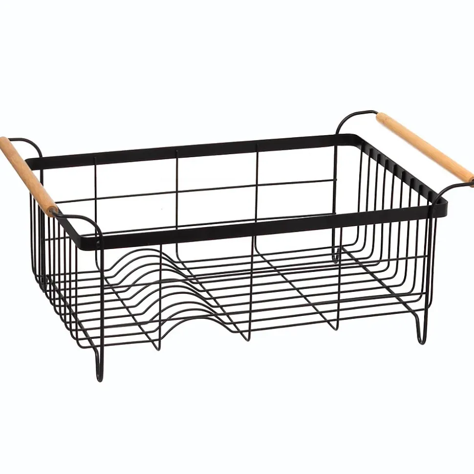 Dimensions : L. 43 x P. 32 x H. 18.6 cmDimensions plateau : L. 43 x P. 32 x H. 2 cmDimensions égouttoir : L. 42,5 x P. 29 x H. 18,1 cmPoids : 1,46 kgMatière de la structure : AcierMatière des poignées : HévéaCapacité : 12 assiettes / 6 verresInclus : Pot à ustensiles. Tapis vaisselle