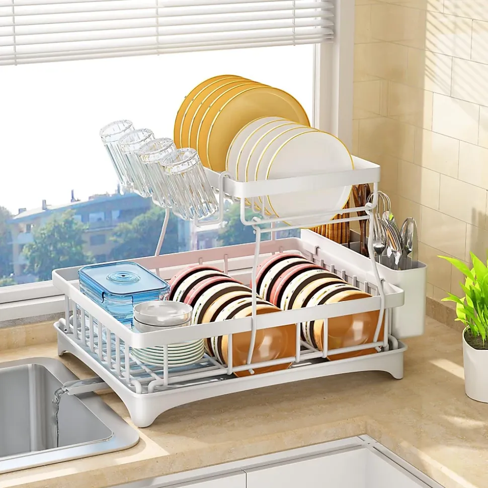 【Design Détachable à 2 Niveaux 】 Cet égouttoir à vaisselle dispose d’un design amovible à 2 niveaux, offrant un très grand espace pour ranger la vaisselle de différentes tailles telles que les assiettes, les assiettes, les tasses, les poêles, les casseroles et les bols. Avec un porte-ustensiles, un porte-gobelet, cet égouttoir à vaisselle répondra à tous vos besoins de stockage et d’égouttage des ustensiles de cuisine.【Construction Robuste】Notre égouttoir à vaisselle pour comptoir de cuisine est fabriqué en acier au carbone de qualité supérieure avec finition en poudre blanc. La construction robuste fournira une forte capacité de charge pour ranger tous vos ustensiles de cuisine facilement.【Système De Drainage Rapide】L’égouttoir à vaisselle dispose d’un égouttoir amovible qui comprend des trous de drainage centraux et un bec pivotant, assurant que l’eau coule directement dans l’évier, pas sur le plan de travail. Le bec pivotant est rotatif à 360 °, vous permettant de régler la position de l’égouttoir plus librement selon l’emplacement de l’évier.【Égouttoir Multifonction Et Design Attentionné】 Notre égouttoir à vaisselle est non seulement conçu avec le support d’assiette, mais également livré avec un porte-gobelet et un porte-ustensiles pour répondre à vos besoins de stockage des ustensiles de cuisine avec un accrochage sans effort. De plus, la clôture surélevée autour de la base du support empêche efficacement la vaisselle de tomber et de se casser.