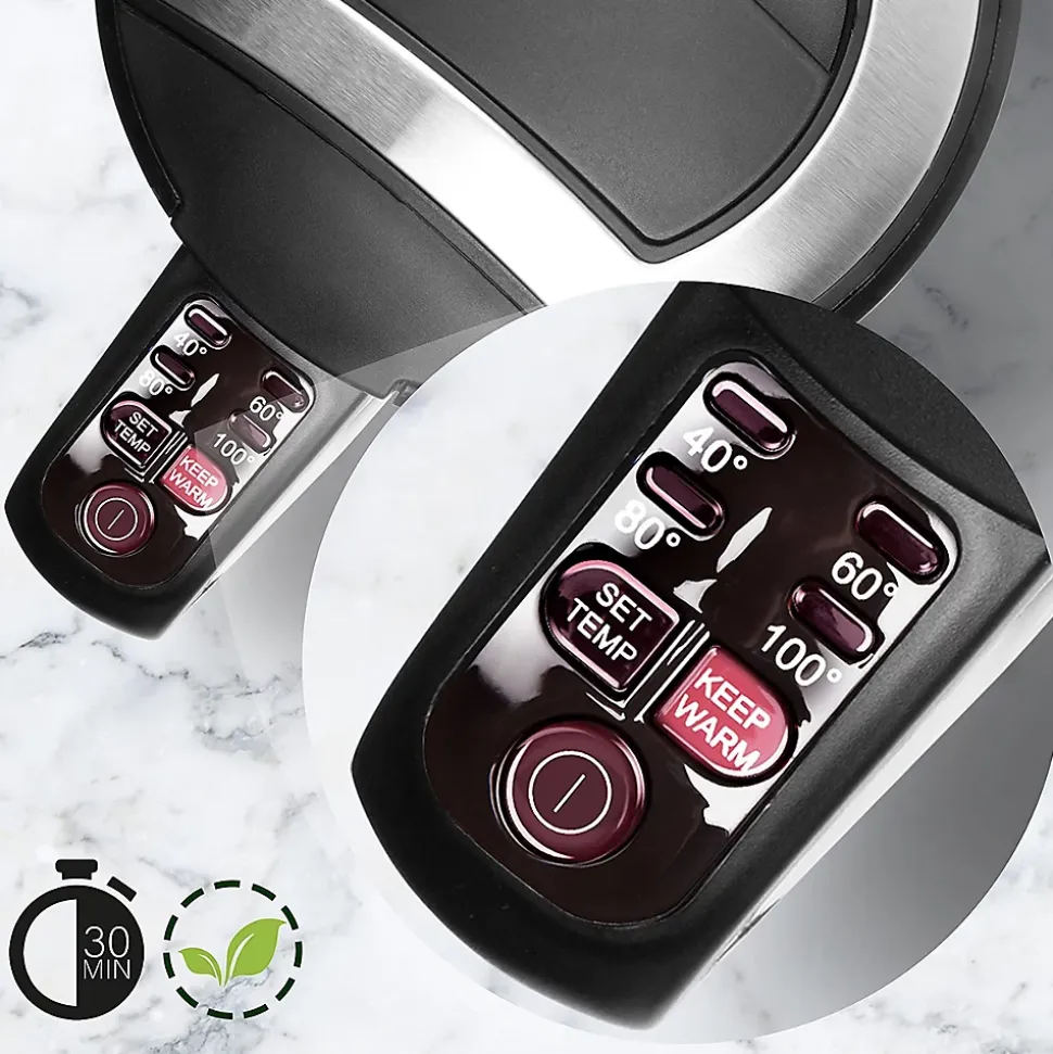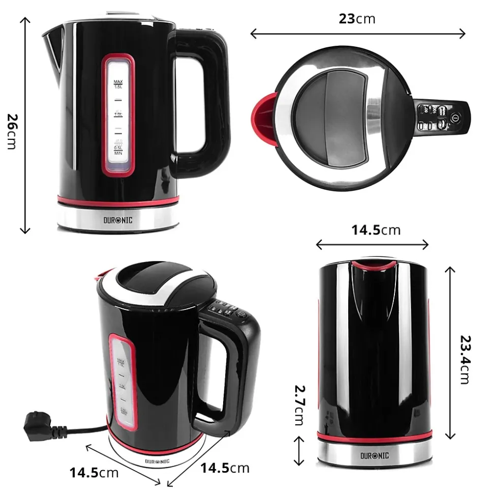 La bouilloire a une puissance de chauffe de 3000W grâce à laquelle votre eau atteindra la température souhaitée plus rapidement : vous consommerez donc moins d’énergie et attendrez moins longtemps ! De plus, cette bouilloire vous permet de sélectionner une température parmi 40° / 60° / 80° / 100° ce qui vous aidera à respecter les recommandations pour chaque boisson. En effet, tous les thés et cafés nécessitent une température différente et bien précise, sans quoi l’arôme est altéré.Avec l’EK30 de Duronic, vous pouvez également décider de garder l’eau à la température sélectionnée pendant 30 minutes. Si, pendant ce délai, la température baisse de 2° alors la bouilloire chauffera l’eau pour que celle-ci revienne à la température souhaitée. Cette fonction est idéale pour les utilisateurs intensifs, ceux qui aiment se servir une deuxième tasse ou les lieux de passage comme un environnement professionnel.La bouilloire bénéficie d’une fenêtre et de mesures sur chaque côté afin qui vous puissiez jauger la quantité d’eau disponible. La base à 360° signifie que la bouilloire peut être posée dans n’importe quel sens: pratique pour les gauchers aussi bien que les droitiers et plus encore pour ceux qui ont du mal à se réveiller. Réalisée en acier inoxydable et en plastique, la bouilloire a une double paroi afin d’éviter les fuites, plutôt communes sur les modèles à simple paroi.Toutes les bouilloires nécessitent un nettoyage régulier afin de retirer les dépôts de calcaire contenu dans l’eau. Pour vous assurer une boisson de qualité, un filtre en acier inoxydable et à mailles fines permet d’écarter certaines impuretés. Cette bouilloire est également équipée d’une protection anti-surchauffe afin qu’elle ne puisse se mettre en route si la quantité d’eau est inférieure à 0,5 L. Ce modèle est disponible en noir et blanc. Idéal pour thés, cafés, chocolats chauds, pâtes, etc.