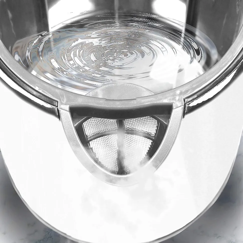La bouilloire a une puissance de chauffe de 3000W grâce à laquelle votre eau atteindra la température souhaitée plus rapidement : vous consommerez donc moins d’énergie et attendrez moins longtemps ! De plus, cette bouilloire vous permet de sélectionner une température parmi 40° / 60° / 80° / 100° ce qui vous aidera à respecter les recommandations pour chaque boisson. En effet, tous les thés et cafés nécessitent une température différente et bien précise, sans quoi l’arôme est altéré.Avec l’EK30 de Duronic, vous pouvez également décider de garder l’eau à la température sélectionnée pendant 30 minutes. Si, pendant ce délai, la température baisse de 2° alors la bouilloire chauffera l’eau pour que celle-ci revienne à la température souhaitée. Cette fonction est idéale pour les utilisateurs intensifs, ceux qui aiment se servir une deuxième tasse ou les lieux de passage comme un environnement professionnel.La bouilloire bénéficie d’une fenêtre et de mesures sur chaque côté afin qui vous puissiez jauger la quantité d’eau disponible. La base à 360° signifie que la bouilloire peut être posée dans n’importe quel sens: pratique pour les gauchers aussi bien que les droitiers et plus encore pour ceux qui ont du mal à se réveiller. Réalisée en acier inoxydable et en plastique, la bouilloire a une double paroi afin d’éviter les fuites, plutôt communes sur les modèles à simple paroi.Toutes les bouilloires nécessitent un nettoyage régulier afin de retirer les dépôts de calcaire contenu dans l’eau. Pour vous assurer une boisson de qualité, un filtre en acier inoxydable et à mailles fines permet d’écarter certaines impuretés. Cette bouilloire est également équipée d’une protection anti-surchauffe afin qu’elle ne puisse se mettre en route si la quantité d’eau est inférieure à 0,5 L. Ce modèle est disponible en noir et blanc. Idéal pour thés, cafés, chocolats chauds, pâtes, etc.