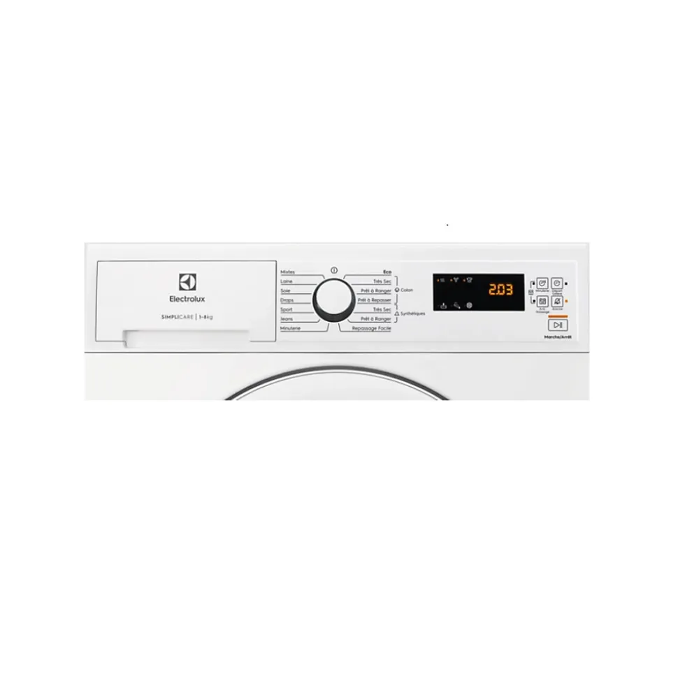 Sèche-linge Pompe à Chaleur Electrolux SimpliCare EDHF4812AC 8 kg A++ Blanc – Séchez votre linge efficacement tout en préservant vos vêtements grâce au sèche-linge Electrolux EDHF4812AC doté de la technologie pompe à chaleur qui sèche à basse température (54°C au lieu de 82°C pour un sèche-linge classique), réduisant ainsi la consommation d’énergie et l’usure des textiles – Son tambour zinc 3 redans d’un volume de 118 L assure une circulation optimale de l’air pour un séchage homogène – Les sondes OptiSense adaptent automatiquement la durée du cycle pour éviter la surchauffe et préserver la qualité des fibres – Son hublot réversible facilite l’installation et s’adapte à toutes les configurations – Profitez de la fonction départ différé jusqu’à 20 heures pour adapter le séchage à votre emploi du temps – Son bac de récupération de 5,32 L en plastique recyclé est accessible en haut à gauche pour une vidange simplifiée – Sécurité renforcée avec indicateurs de nettoyage du filtre, du bac plein et du condenseur. Caractéristiques Capacité 8 kg Type de séchage Pompe à chaleur Programmation Electronique Conso élec 235 kWh / an Niveau sonore 66 dB Volume du tambour 118 L Labels et points clés Eco Label énergie A++ Efficacité de condensation B Le + produit Hublot réversible Disponibilité des pièces détachées 15 ans (donnée constructeur) Matériau du tambour zinc Réservoir d’eau haut Départ différé jusqu’à 20 heures Afficheur Temps Restant oui Connecté non Puissance de raccordement 800 W Intensité 4 A Dimensions (LxHxP) 59,6 x 85 x 62,3 (65 avec hublot) cm Poids net 46 Kg Lieu de fabrication Pologne