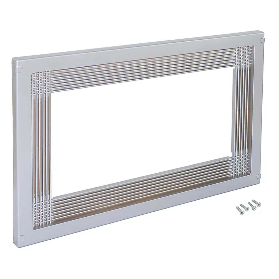 Pour installer sur un module de 600mm de largeur. Fabriqué en plastique peint en gris métallisé. Grillage fin à découper facilement pour l’ajuster au micro-ondes. Fourni avec tout le nécessaire pour son installation : vis, caches, taquets et instructions de montage. VOIR LES MESURES DU PRODUIT DANS LES IMAGES. Cadre pour encastrer le micro-ondes dans un module de cuisine de 600 mm de largeur fabriqué en plastique et avec 3 finitions disponibles : injecté blanc, peint en gris métallisé ou avec recouvrement électrolytique en nickel satiné (effet inox). Dispose d’un grillage fin facile à découper afin de l’ajuster parfaitement à l’appareil et d’obtenir une intégration totale dans le meuble. Fourni avec tout le nécessaire pour le montage afin de faciliter l’installation: vis de fixation, caches pour les vis et 4 taquets pour placer le micro-ondes à la hauteur désirée.