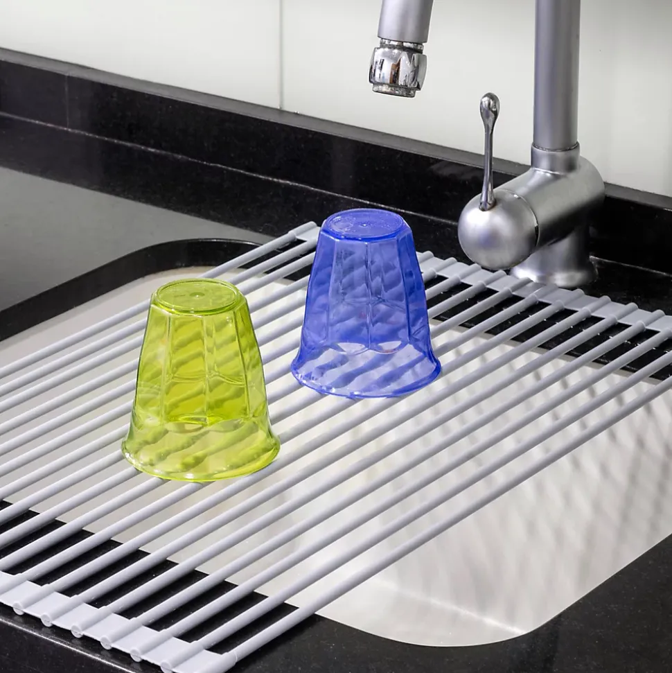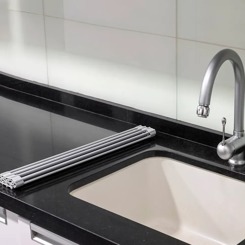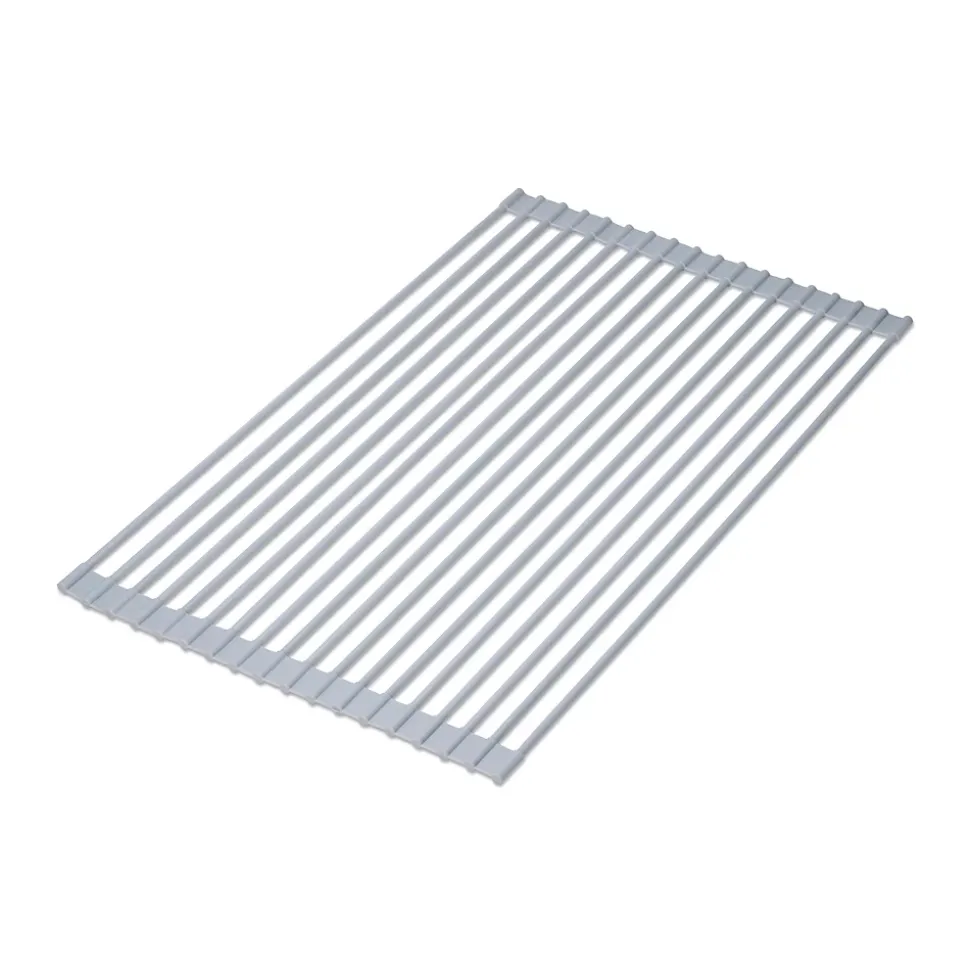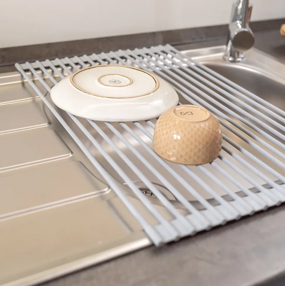 Égouttoir à vaisselle idéal pour égoutter et sécher à l’air la vaisselle, les verres et les ustensiles de cuisine.Économise de l’espace en étant flexible et enroulable. Installation simple.Il peut être utilisé comme dessous de plat pour contenir une casserole chaude ou des articles surgelés car il résiste aux températures de -30º à 230º.Mesure 330 x 520 mm. Veuillez mesurer la taille de votre évier pour vérifier qu’il convient.Supporte jusqu’à 14 kg. Fabriqué en acier et silicone en gris. VOIR LES MESURES DU PRODUIT DANS LES IMAGES. Égouttoir à vaisselle flexible et enroulable avec supports pour assiettes et verres en acier et silicone gris. Améliorez et optimisez l’espace dans votre cuisine grâce à sa flexibilité et sa facilité d’installation. Il peut être utilisé comme dessous de plat pour contenir une casserole chaude ou des articles surgelés car il résiste aux températures de -30º à 230º. Supporte jusqu’à 14 kg et mesure 330 x 520 mm. Veuillez mesurer la taille de votre évier pour vérifier qu’il convient.