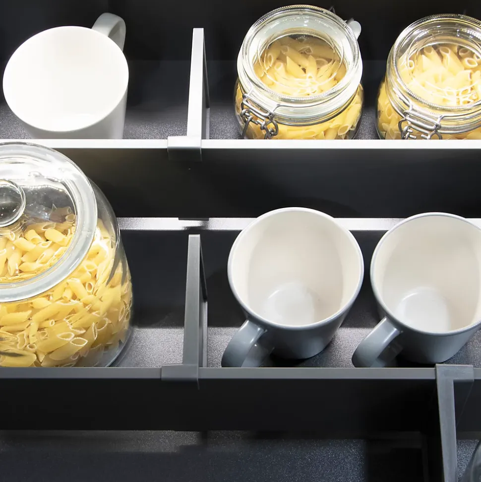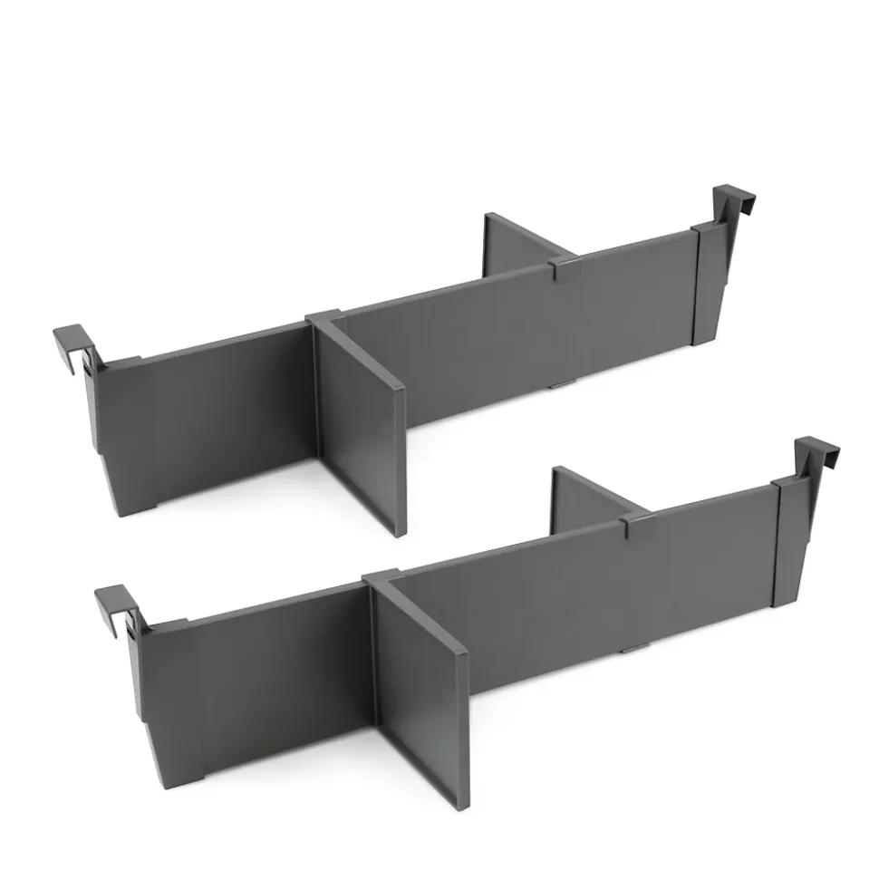 Jeu de séparateurs réglables pour tiroirs conçu pour modules de 600 mm de largeur et profondeur minimale de 350 mm. Fabriqué en aluminium et plastique avec finition gris anthracite, facile à monter sans outils. Comprend 2 profils en aluminium, 4 adaptateurs latéraux en plastique, 4 séparateurs en plastique et notice de montage.