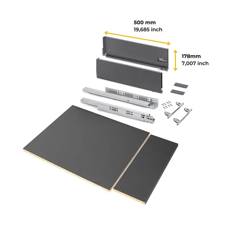 Kit de ferrures nécessarie pour le montage d’un tiroir, hauteur 178 mm et profondeur de 500 mm, à l’exception de la face avant du tiroir, en modules d’une largeur de 450 mm et d’une épaisseur de côté de 16 mm.Coulisses à sortie totale synchronisés, avec fermeture amortie et charge jusqu’à 40 kg.Dimensions panneaux: profondeur 399 x 490 mm et arrière 376 x 148 mm. Possibilité de découper les panneaux pour ajuster la largeur du tiroir à la mesure souhaitée.U dispose d’un réglage frontal en 3D : vertical au moyen d’un excentrique de ±2 mm, horizontal ±1 mm, inclinaison -1,5/+4 mm.Fabriqué en acier peint gris anthracite et aggloméré avec mélamine de la même couleur. VOIR LES MESURES DU PRODUIT DANS LES IMAGES. Kit pour tiroir de cuisine et salle de bain avec tous les éléments nécessaires à son montage. C’est la solution optimale pour vos meubles de cuisine, de salle de bain ou d’armoire avec un design élégant en gris anthracite et blanc. Chaque kit est composé de tous les éléments nécessaires au montage d’un tiroir extérieur de hauteur 178mm et d’une profondeur de 500 mm avec différentes largeurs de modules. Comprend: deux côtés latérales, un ensemble de guides à fermeture amortie, un ensemble de couvre-garnitures, des panneaux inférieur et arrière et des attaches avant de tiroir. Vous aurez simplement besoin du panneau avant avec les dimensions nécessaires du tiroir.Les côtés latérales métalliques sont en acier avec finition peinte gris anthracite et blanc, permettent de régler la façade du tiroir ± 2 mm verticalement, ± 1 mm horizontalement et -1,5/+4 mm en inclinaison. Les guides sont à sortie totale avec fermeture amortie et permettent une charge maximale de 40 Kg pour le tiroir.Les panneaux