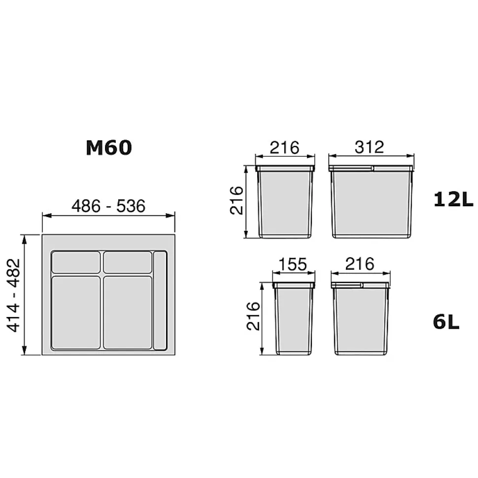 Poubelles de 216 mm de hauteur avec base pour tiroir de module de 600 mm. Le jeu comprend une poubelle de 12 litres de capacité et 2 poubelles de 6 litres. Fabriquées en plastique couleur gris anthracite. Base avec bords à découper pour les adapter aux dimensions intérieures du tiroir. Les poubelles sont dotées d’une anse en couleur afin de mieux identifier les déchets, ainsi que pour faciliter leur extraction, et donc leur vidage et nettoyage. VOIR LES MESURES DU PRODUIT DANS LES IMAGES. Les poubelles pour tiroir Recycle Emuca , intégrées dans les meubles de la cuisine, permettent de séparer plus facilement les déchets de façon discrète et organisée. Elles sont compatibles avec des modules de 60 cm, 80 cm et 90 cm de largeur, et sont disponibles en deux hauteurs, permettant plusieurs configurations avec une capacité utile de 24 litres à 44 litres.Elles sont compatibles avec toute sorte de tiroirs grâce à leurs bases à découper, qui s’adaptent parfaitement à l’espace utile. Ces poubelles sont dotées d’une anse colorée afin de mieux identifier les déchets, ainsi que pour faciliter leur extraction, et donc leur vidage et nettoyage.