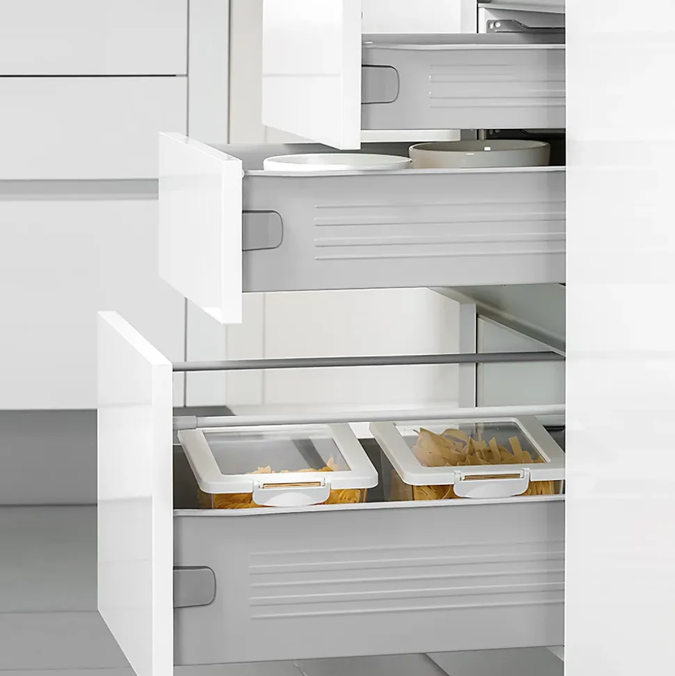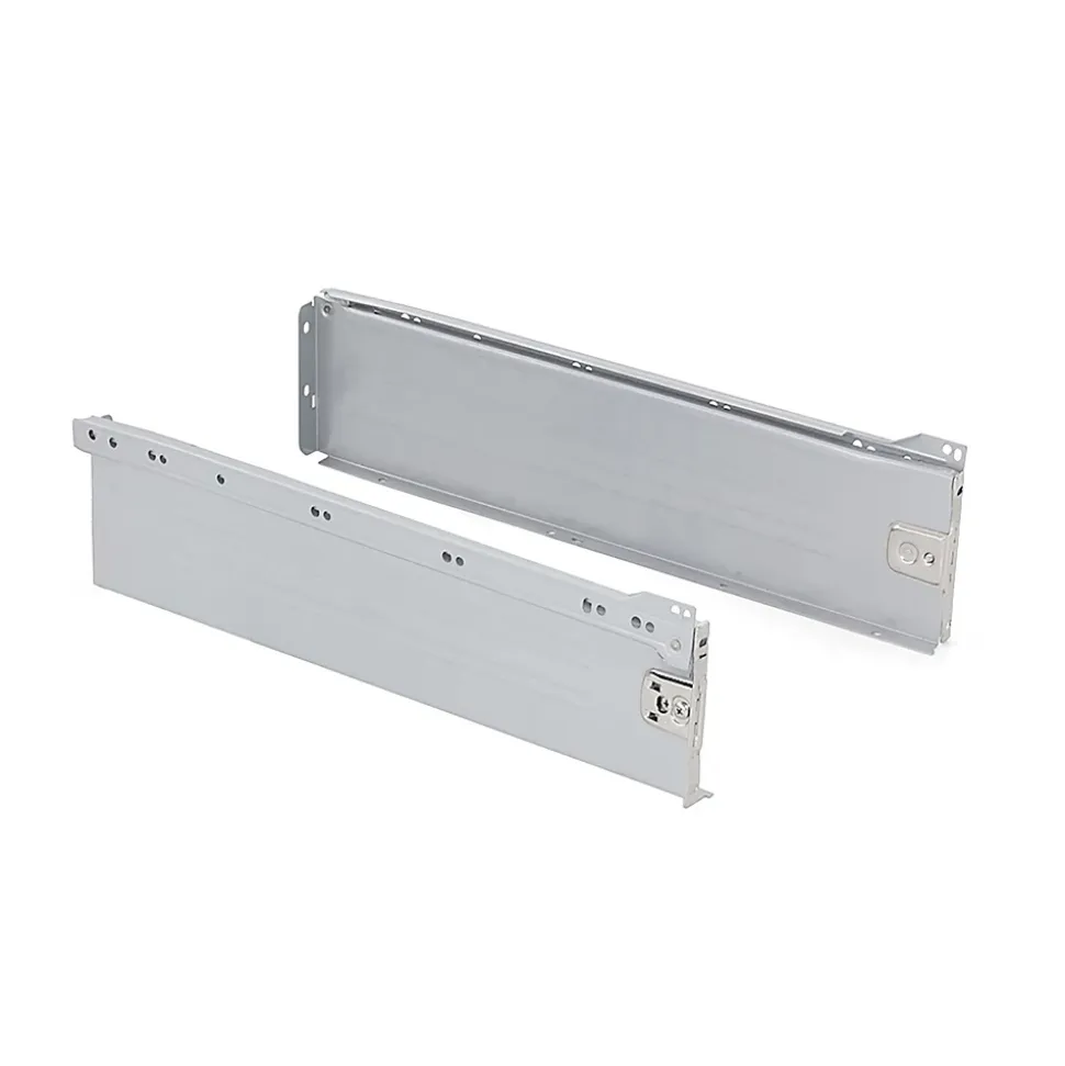 Tiroir Ultrabox pour la cuisine et la salle de bain avec côtés en acier et coulisses à roulettes en acier finition aluminium peint. Il s’agit de la meilleure option avec le meilleur rapport qualité-prix pour les tiroirs de la cuisine et de la salle de bain. Le kit contient tous les accessoires pour le montage d’un tiroir : côtés, jeu de coulisses et fixations frontales. Les panneaux pour la base, la façade arrière et la façade du tiroir, à couper aux dimensions correctes, ne sont pas inclus.Fixations frontales fournies sont déjà montées sur les côtés métallique et permettent un réglage excentrique de ±2 mm à la verticale. Tiroir en acier composé de deux côtés et coulisses à roulettes à fermeture avec chute. Hauteur du côté 150 mm et profondeur 400 mm. Le fond ne requiert pas d’usinage. Capacité de fixation améliorée sur le côté. Fourni avec fixation prémontée sur le côté. Réglage à excentrique ±2 mm à la verticale. Capacité de charge maximum 25 kg. Fabriqué en acier peint gris métallisé RAL 9022. Possibilité de montage avec fermeture amortie (non incluse). VOIR LES MESURES DU PRODUIT DANS LES IMAGES.