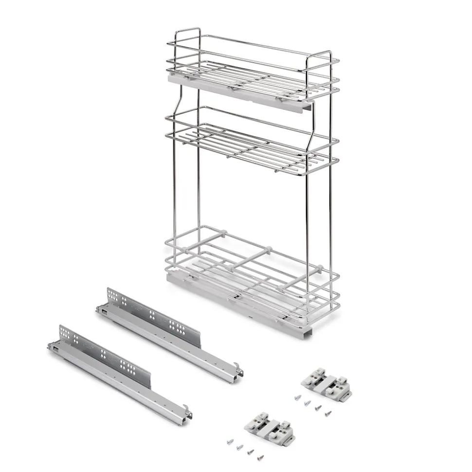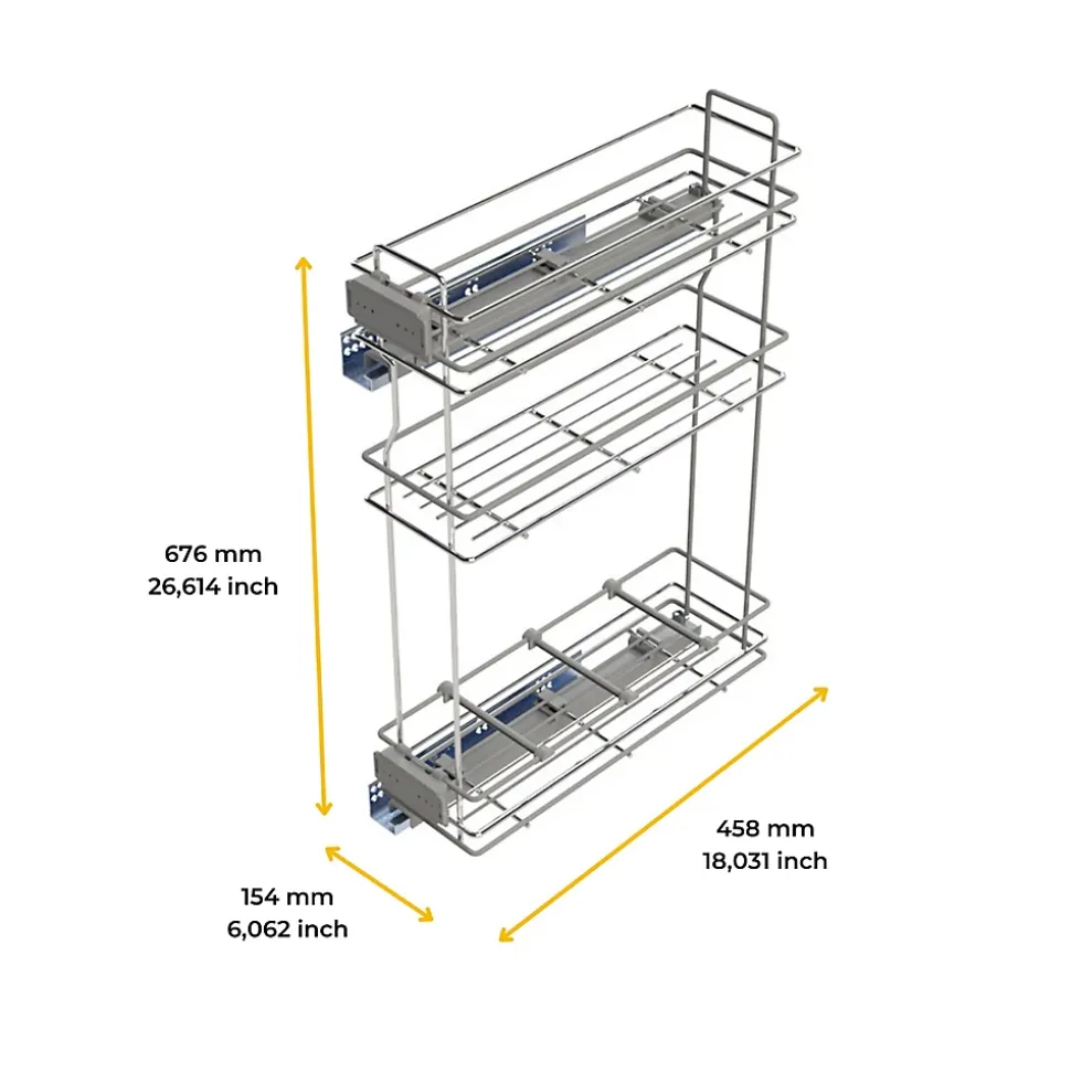 Le porte-bouteilles extractible SupraMax dispose de trois niveaux de rangement et de trois séparateurs dans le panier inférieur, ce qui permet d’organiser efficacement les bouteilles. C’est la solution idéale pour optimiser l’espace dans les modules inférieurs de la cuisine, en particulier dans les espaces réduits.Compatible avec des modules d’une largeur intérieure minimale de 162 mm, profondeur minimale de 460 mm et une hauteur de 800 mm. Il a une capacité de charge allant jusqu’à 30 kg.Le montage se fait sur le côté gauche du meuble à l’aide de deux glissières à rouleaux avec extraction totale et fermeture amortie. Compatible avec des panneaux de 16, 18 et 19 mm.Il dispose d’un réglage complet de la porte : ±2,5 mm sur les côtés, ±2,25 mm en profondeur et jusqu’à 13 mm en hauteur. Le glissement est fluide et silencieux, idéal pour un usage quotidien.Fabriqué en acier chromé avec des entretoises en plastique gris. VOIR LES MESURES DU PRODUIT DANS LES IMAGES. Conçu pour des modules de 800 mm de hauteur, le porte-bouteilles coulissant SupraMax est la solution idéale pour optimiser le rangement dans les modules inférieurs de la cuisine, en particulier dans les espaces réduits. Conçu pour organiser les bouteilles de manière efficace, ce modèle permet de tirer le meilleur parti des espaces auxiliaires des meubles de cuisine. Grâce à son design extractible, il offre un accès facile et confortable au contenu de ses paniers, ce qui en fait une option idéale pour maintenir l’ordre dans la cuisine.Fabriqué en fil d’acier, le porte-bouteilles SupraMax possède une structure robuste et durable. Il est installé sur le côté gauche des unités de cuisine et est compatible avec les modules de planche de 16, 18 et 19 mm.. Il inclut trois niveaux de