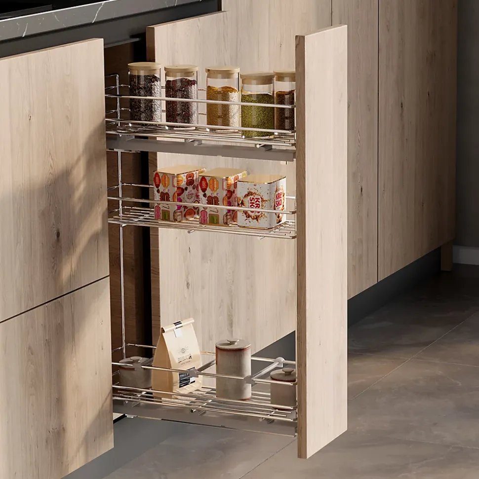 Le porte-bouteilles extractible SupraMax EMUCA optimise l’espace dans les modules inférieurs de cuisine grâce à sa conception élégante en acier chromé et sa fermeture amortie. Facile à installer sur le côté gauche, il dispose de trois niveaux de rangement avec une capacité de charge de 30 kg et s’adapte aux modules standards de 200 mm. Avec des glissières invisibles à extraction totale, il garantit un glissement fluide et silencieux pour un usage quotidien confortable.
