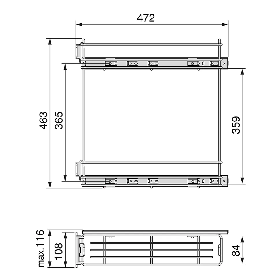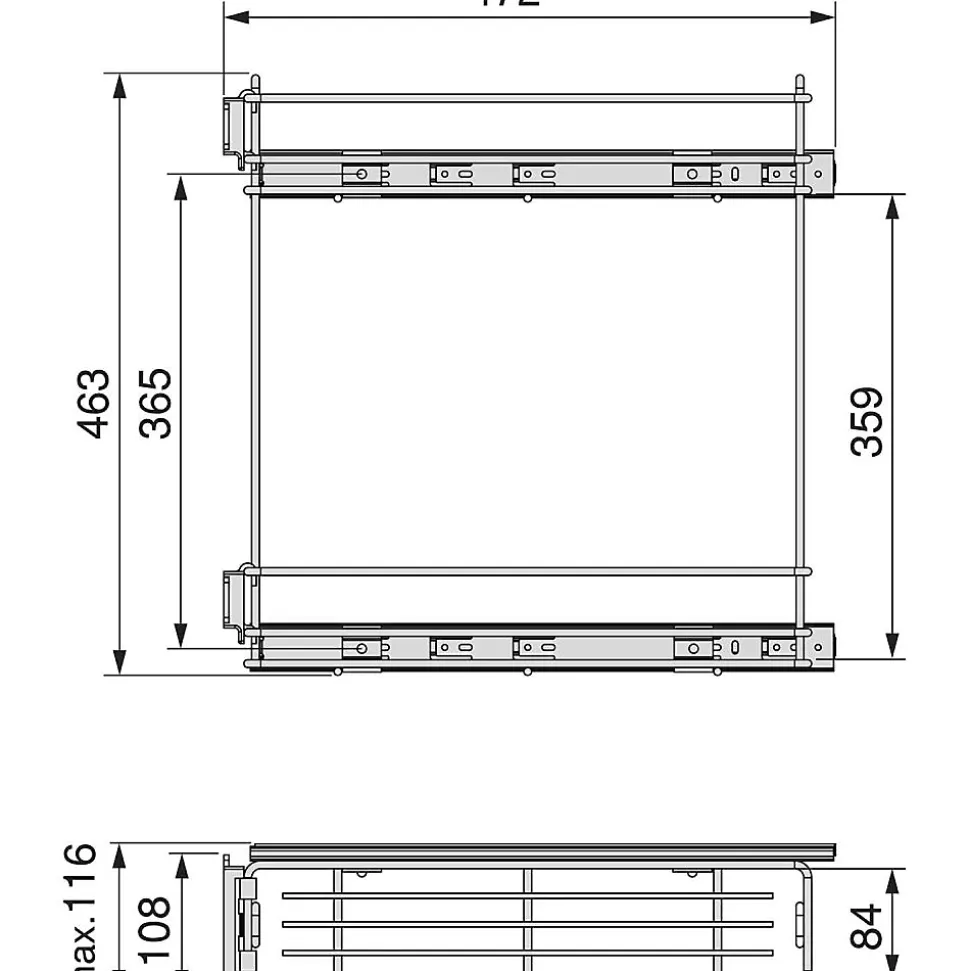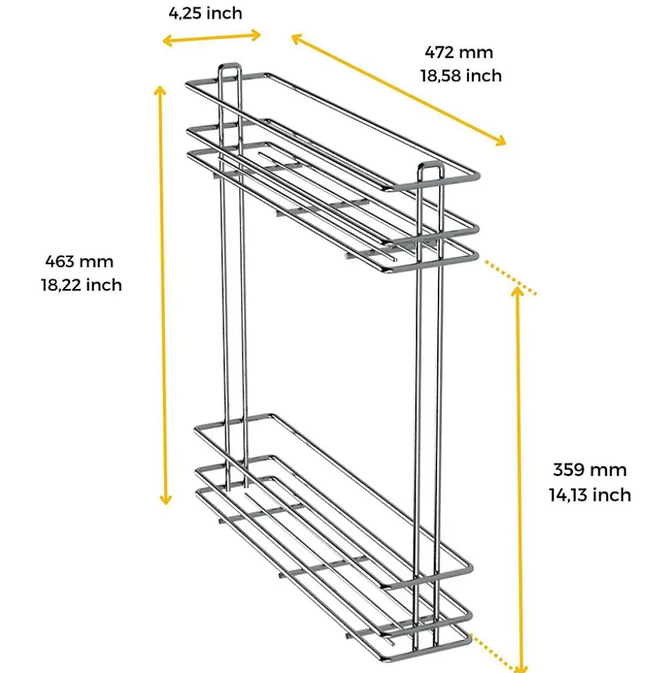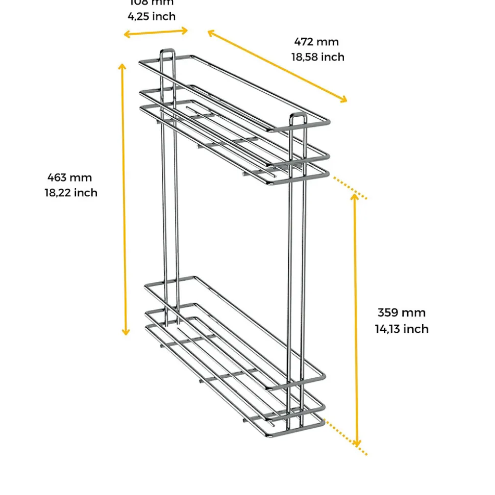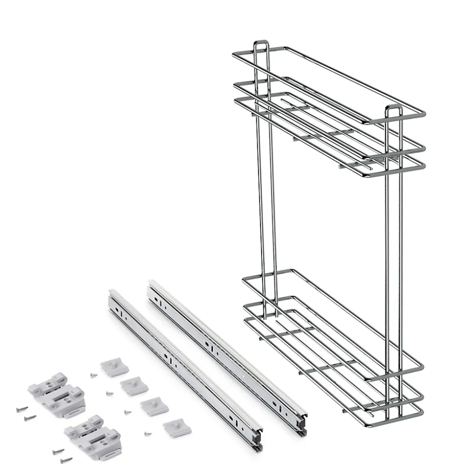 Porte-bouteilles coulissant avec deux paniers, idéal pour les petits espaces dans la cuisine.Convient aux meubles d’une largeur intérieure minimale de 112 mm et d’une profondeur minimale de 474 mm. Compatible avec les modules à panneaux de 16, 18 et 19 mm.Capacité de charge jusqu’à 15 kg et ajustement total de la porte (5D). Réglage de ±2,5 mm sur les côtés, ±2,25 mm en profondeur et jusqu’à 13 mm en hauteur.Installation facile des deux côtés de l’armoire grâce à 2 coulisses à billes à sortie partielle.Structure élégante en acier chromé. VOIR LES MESURES DU PRODUIT DANS LES IMAGES. Porte-bouteilles extractible SupraMax pour meubles bas de cuisine en acier chromé, idéal pour les petits espaces ou les meubles d’appoint. Facile à installer : La fixation se fait des deux côtés de l’armoire et permet un réglage total de la porte (5D), ±2,5 mm sur les côtés, ±2,25 mm en profondeur et jusqu’à 13 mm en hauteur.La structure est en acier chromé à 2 niveaux et comprend des glissières à roulement à billes à extraction partielle. Capacité de charge jusqu’à 15 kg.