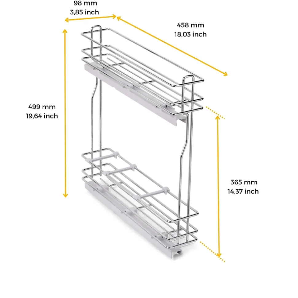 Rangement coulissant pour bouteilles de cuisine avec deux paniers et 3 séparateurs pour le panier inférieur.Valable pour les modules d’une largeur intérieure minimale de 112 mm et d’une profondeur minimale de 460 mm. Compatible avec les modules avec des panneaux de 16, 18 et 19 mm.Capacité de charge jusqu’à 30 kg et ajustement total de la porte (5D). Réglage de ±2,5 mm sur les côtés, ±2,25 mm en profondeur et jusqu’à 13 mm en hauteur.Montage facile sur le côté gauche au moyen de 2 guides à rouleaux avec extraction totale et fermeture en douceur.Structure élégante en acier chromé et cloisons en plastique gris. VOIR LES MESURES DU PRODUIT DANS LES IMAGES. Porte-bouteilles extractible SupraMax pour meubles bas de cuisine en acier chromé, idéal pour les petits espaces ou les meubles d’appoint. Facile à installer : La fixation se fait sur le côté gauche de l’élément et permet un réglage total de la porte (5D), ±2,5 mm sur les côtés, ±2,25 mm en profondeur et jusqu’à 13 mm en hauteur.La structure est en acier chromé à 2 niveaux et comprend des guides à rouleaux à extraction totale et à fermeture douce qui permettent au système de glisser en douceur et d’éviter les claquements. Le panier inférieur comprend 3 séparateurs en plastique gris pour l’organisation des bouteilles. Capacité de charge jusqu’à 30 kg.