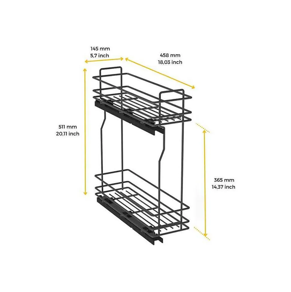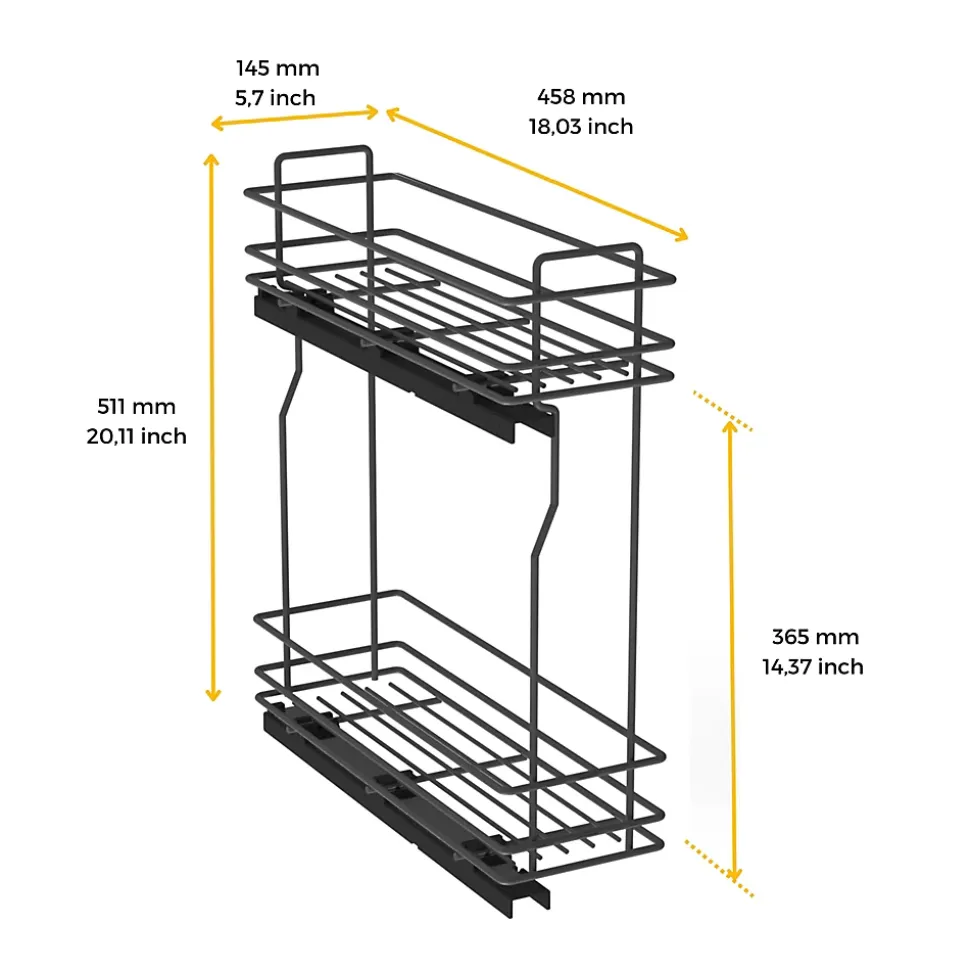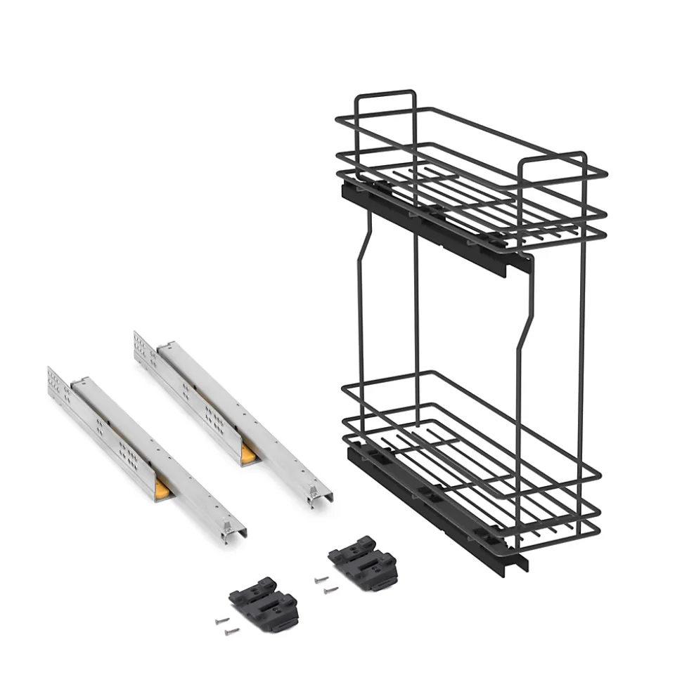 Rangement coulissant pour bouteilles de cuisine avec deux paniers et 3 séparateurs pour le panier inférieur.Valable pour les modules d’une largeur intérieure minimale de 162 mm et d’une profondeur minimale de 460 mm. Compatible avec les modules avec des panneaux de 16, 18 et 19 mm.Capacité de charge jusqu’à 30 kg et ajustement total de la porte (5D). Réglage de ±2,5 mm sur les côtés, ±2,25 mm en profondeur et jusqu’à 13 mm en hauteur.Montage facile sur le côté gauche au moyen de 2 guides à rouleaux avec extraction totale et fermeture en douceur.Structure en acier avec finition gris anthracite et séparateurs en plastique gris. VOIR LES MESURES DU PRODUIT DANS LES IMAGES. Porte-bouteilles coulissant TitaneMax pour meubles bas de cuisine en finition gris anthracite, idéal pour les petits espaces ou les meubles d’appoint.Facile à installer : La fixation se fait sur le côté gauche de l’élément et permet un réglage total de la porte (5D), ±2,5 mm sur les côtés, ±2,25 mm en profondeur et jusqu’à 13 mm en hauteur.La structure est en acier à 2 niveaux et comprend des guides à rouleaux à extraction totale et à fermeture douce qui permettent au système de glisser en douceur et d’éviter les claquements. Le panier inférieur comprend 3 séparateurs en plastique gris anthracite pour organiser les bouteilles. Capacité de charge jusqu’à 30 kg.