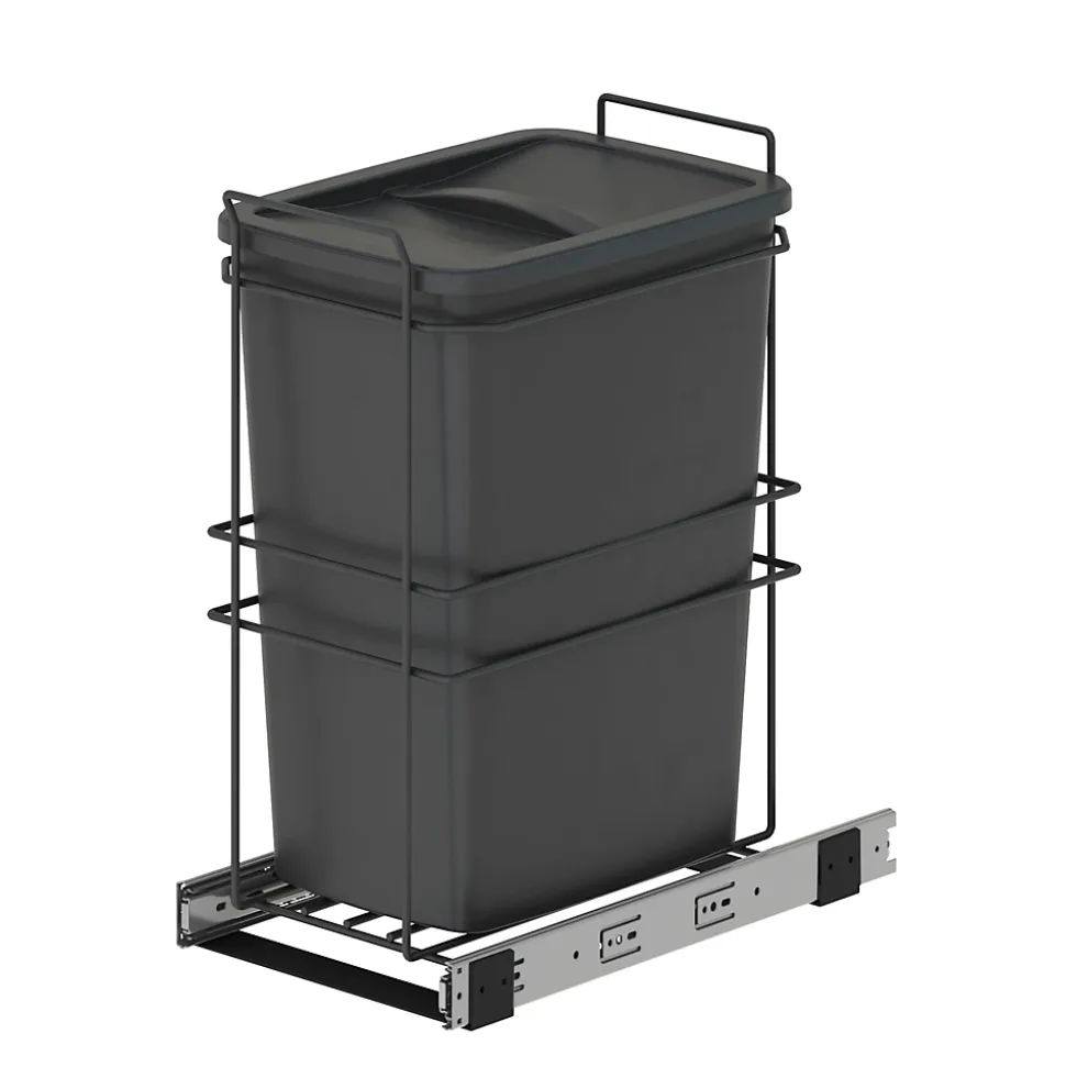 Conteneur de recyclage amovible qui permet de séparer et de classer les déchets ménagers.Il a des guides à billes avec extraction totale et fermeture en douceur pour un accès manuel facile.Il est facile à installer en le vissant au bas du module avec les vis incluses dans le produit.Il est valable pour une installation dans des modules avec des mesures internes minimales de largeur 264 mm, profondeur 460 mm et hauteur 528 mm.Il est fait d’acier et de plastique dans une finition gris anthracite. Il dispose d´une poubelle d’une capacité de 35 litres. VOIR LES MESURES DU PRODUIT DANS LES IMAGES. Le bac de recyclage amovible Recycle est idéal pour séparer et classer les déchets ménagers. Sa structure est dotée de guides à billes à extraction totale et fermeture amortie pour un accès manuel aux seaux.Il se caractérise par sa facilité d’installation vissé sur la partie inférieure du module avec les vis incluses dans le produit. Il est valable pour les modules dont les dimensions utiles minimales sont de 264 mm de large, 460 mm de profondeur et 528 mm de haut.Il dispose de un poubelle d’une capacité de 35 litres. Il est fait d’acier et de plastique avec une élégante finition gris anthracite.