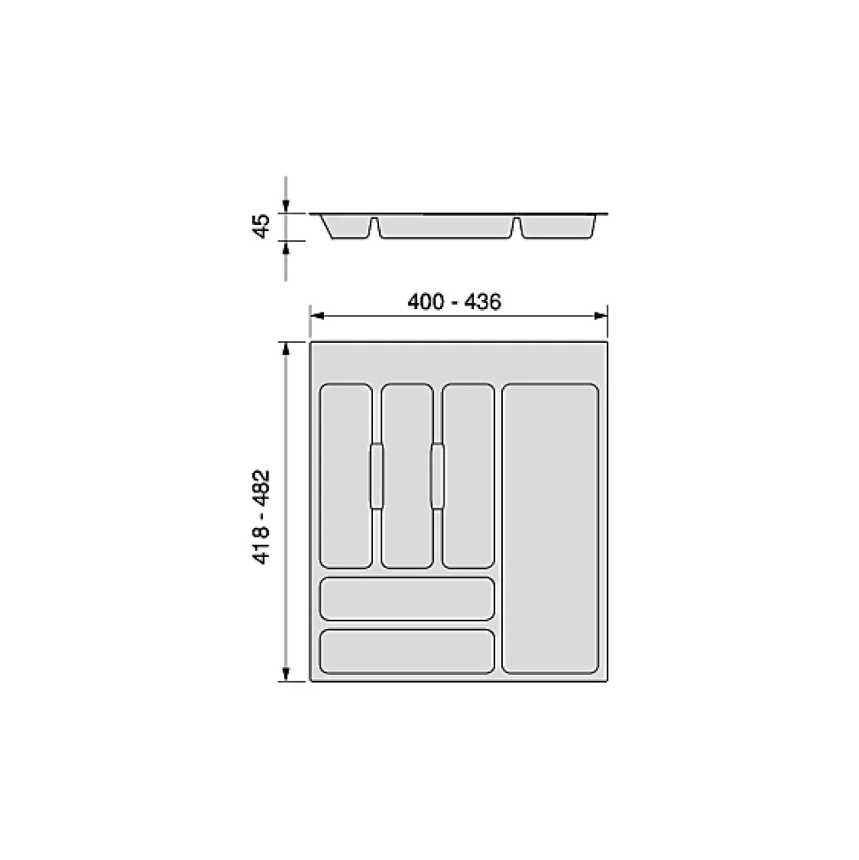 Range-couverts de 436x482mm dimensionné pour tiroirs de module de largeur 500 mm.Convient pour des profondeurs de tiroirs comprises entre 450 mm et 500 mm avec des épaisseurs de planches comprises entre 16 mm et 19 mm.Découpable pour s’adapter à des profondeurs entre 418 mm et 482 mm et des largeurs entre 400 mm et 436 mm.Plateau à couverts avec 6 compartiments pour couteaux, cuillères, fourchettes et tous types de couverts. Pour stocker et organiser les couverts dans le tiroir de la cuisine.Fabriqué en plastique gris anthracite. VOIR LES MESURES DU PRODUIT DANS LES IMAGES. Range-couverts pour tiroirs universels de la cuisine, à lignes droites et grande capacité de stockage pour les couverts et autres ustensiles de la cuisine, qui permet de profiter au maximum de l’espace. Comme ils sont recoupables, il peuvent être adaptés pour installation dans les tiroirs pour modules de largeur standard entre 400 mm et 900 mm, de profondeur entre 450 mm et 500 mm avec de panneau d’épaisseurs comprises entre 16 mm et 19 mm selon le modèle sélectionné.