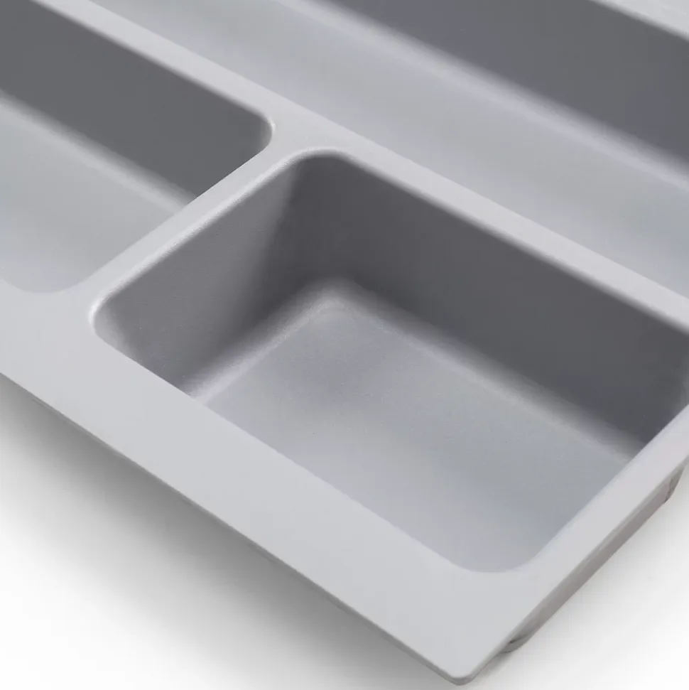 Range-couverts de 736x482mm dimensionné pour tiroirs de module de largeur 800 mm.Convient pour des profondeurs de tiroirs comprises entre 450 mm et 500 mm avec des épaisseurs de planches comprises entre 16 mm et 19 mm.Découpable pour s’adapter à des profondeurs entre 418 mm et 482 mm et des largeurs entre 700 mm et 736 mm.Plateau à couverts avec 9 compartiments pour couteaux, cuillères, fourchettes et tous types de couverts. Pour stocker et organiser les couverts dans le tiroir de la cuisine.Fabriqué en plastique gris. VOIR LES MESURES DU PRODUIT DANS LES IMAGES. Range-couverts pour tiroirs universels de la cuisine, à lignes droites et grande capacité de stockage pour les couverts et autres ustensiles de la cuisine, qui permet de profiter au maximum de l’espace. Comme ils sont recoupables, il peuvent être adaptés pour installation dans les tiroirs pour modules de largeur standard entre 400 mm et 900 mm, de profondeur entre 450 mm et 500 mm avec de panneau d’épaisseurs comprises entre 16 mm et 19 mm selon le modèle sélectionné.