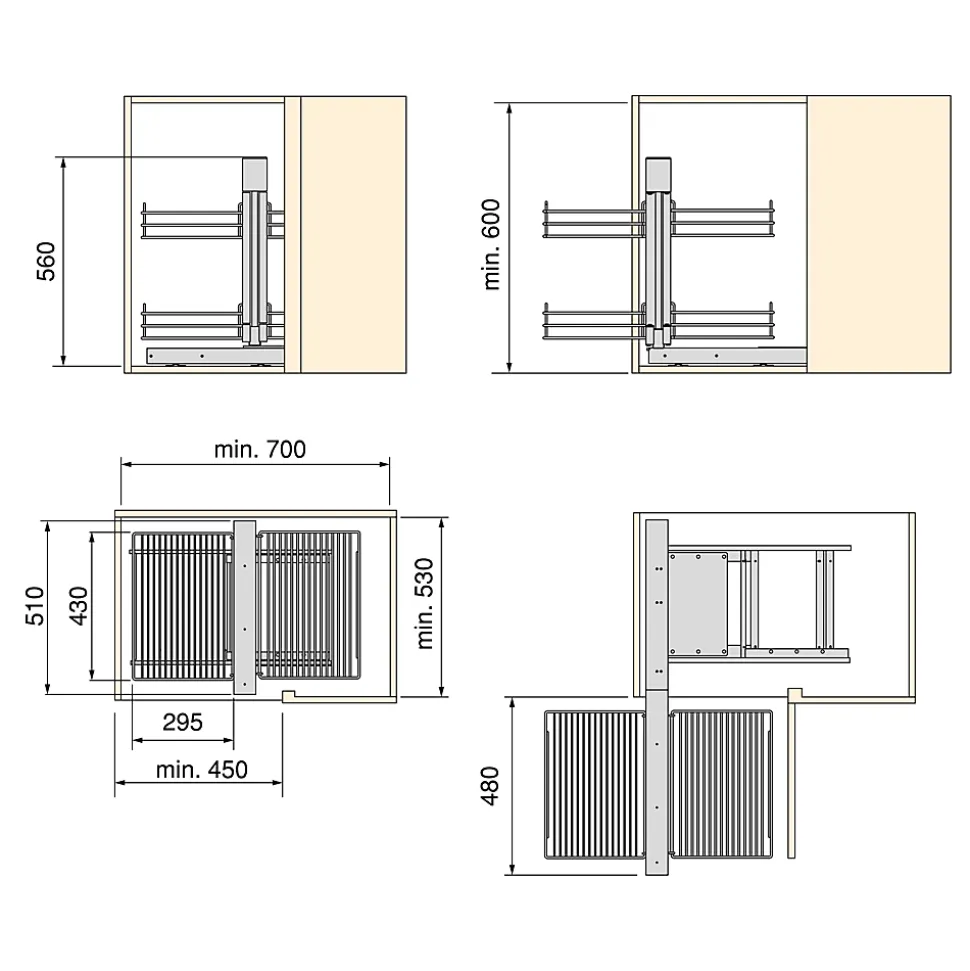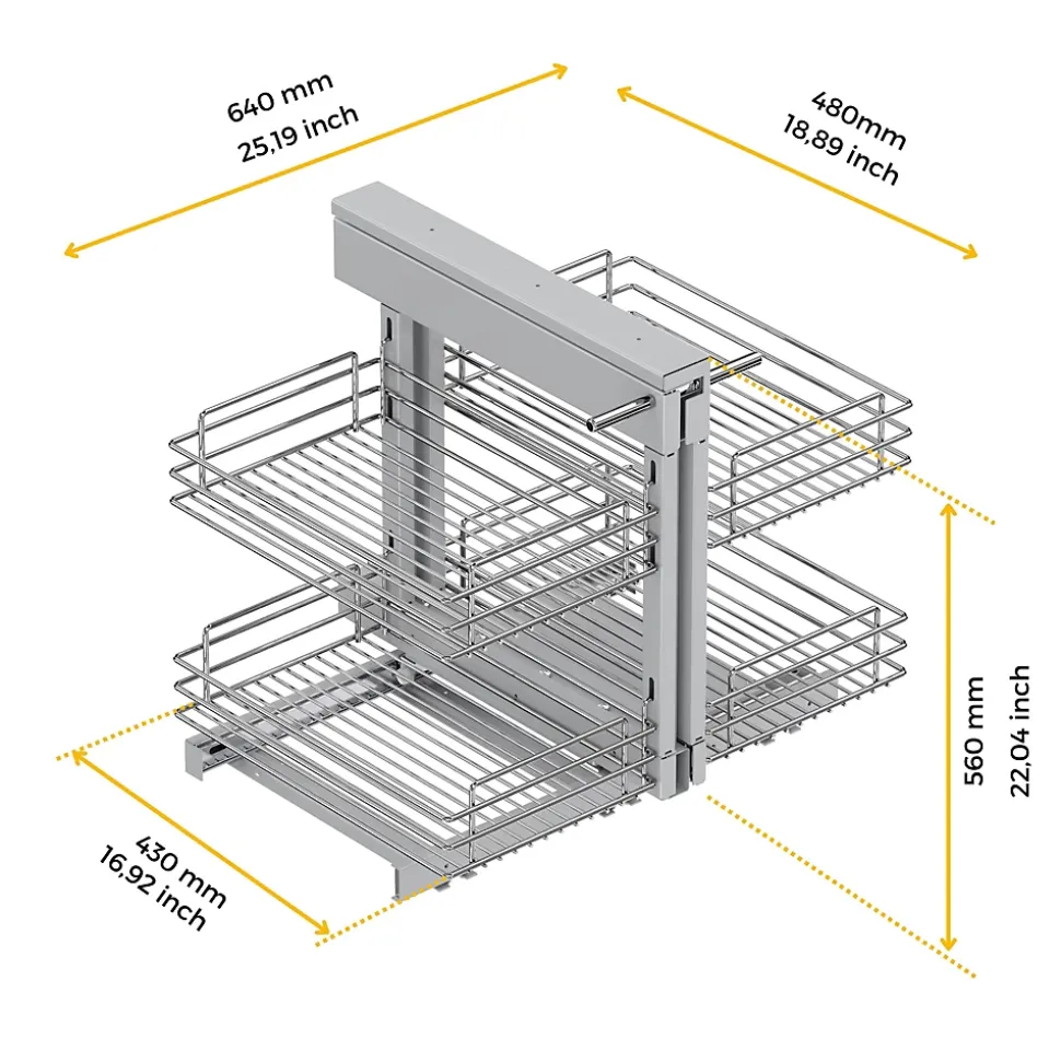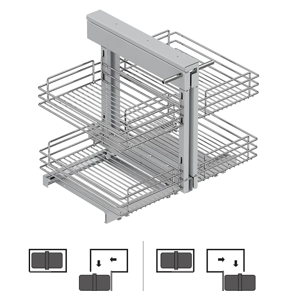 Meuble d’angle à charnières pour optimiser l’espace dans les meubles d’angle de la cuisine.Les 4 paniers s’ouvrent complètement pour faciliter l’accès aux ustensiles et le système comprend une fermeture en douceur.Il peut être assemblé pour s’ouvrir à droite ou à gauche.Le système se compose d’un cadre et de 4 paniers en acier chromé. Il a une capacité de charge allant jusqu’à 30 kg de poids répartis de chaque côté.Dimensions : 530 mm (profondeur) x 700 mm (largeur) x 600 mm (hauteur) et matériel de montage inclus. Largeur de la porte 450 mm. VOIR LES MESURES DU PRODUIT DANS LES IMAGES. Meuble d’angle articulé coulissant Suprastar. Le meuble d’angle est conçu pour optimiser l’espace des coins et organiser toutes sortes de produits dans votre cuisine. Grâce à ses 4 paniers de grande capacité, vous pouvez ranger n’importe quel accessoire. A noter que le système Suprastar permet d’extraire les 4 paniers depuis l’intérieur du module pour atteindre et présenter rapidement n’importe quel accessoire. Son installation est très simple, vous pouvez choisir de monter l’unité d’angle pour une ouverture à droite ou à gauche. De plus, il comprend un système de fermeture en douceur.Sa capacité de charge est de 15 kg par chariot et de 30 kg au total.La structure est en acier et peinte en gris, tandis que les quatre paniers ont une finition chromée brillante pour une plus grande durabilité.Pour l’installation, un module aux dimensions minimales suivantes est nécessaire : 530 mm (profondeur) x 700 mm (largeur) x 600 mm (hauteur) et une largeur de porte de 450 mm.
