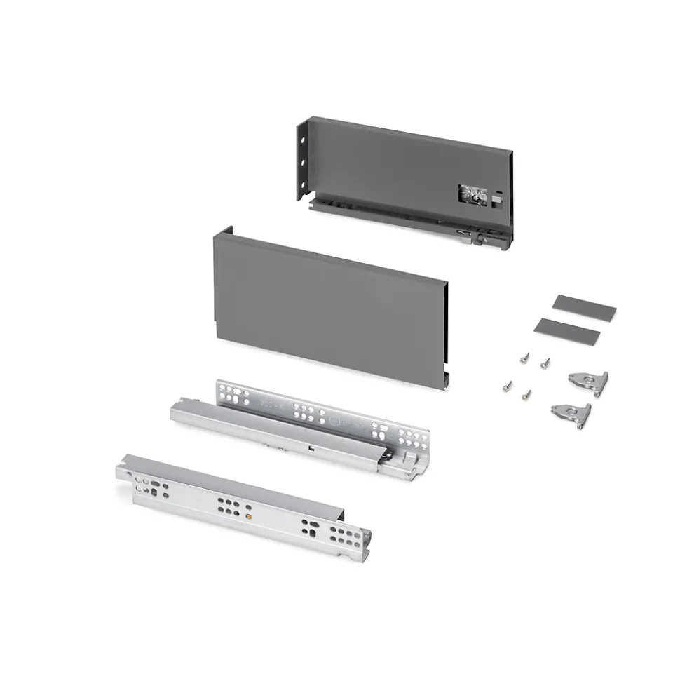Kit de ferrures nécessaires pour le montage d’un tiroir extérieur de hauteur 131 mm et profondeur 300 mm, n’incluant pas le fond, la façade ni la façade arrière. Contient les coulisses à sortie totale, un jeu de côtés, un jeu de fixations arrière et un jeu de fixations frontales pour tiroir extérieur. Les coulisses, à extraction totale et fermeture amortie, offrent une capacité de charge maximum de 30 kg. U dispose d’un réglage frontal: vertical au moyen d’un excentrique de ±2 mm et horizontal ±1 mm. Fabriquées en acier peint gris anthracite. VOIR LES MESURES DU PRODUIT DANS LES IMAGES. Le tiroir de cuisine et salle de bain Protone est disponible en kit avec toutes les ferrures nécessaires pour le montage et offre une grande capacité de charge, jusqu’à 30 kg par tiroir. Le kit contient les coulisses à sortie totale et fermeture amortie , un jeu de fixations et un jeu de côtés , disponibles en finition blanc ou gris anthracite. Vous n’aurez qu’à ajouter les panneaux pour le fond, la façade arrière et la façade du tiroir, avec les dimensions correctes.