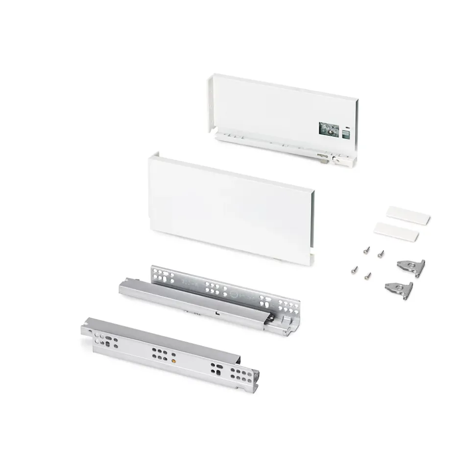 Kit tiroir Emuca Protone capacité 30 kg avec coulisses acier à sortie totale et fermeture amortie, hauteur tiroir 131 mm et profondeur 300 mm; comprend coulisses (paire), côtés, attaches frontales, fixations et instructions, finition visible blanche (aussi disponible en anthracite).