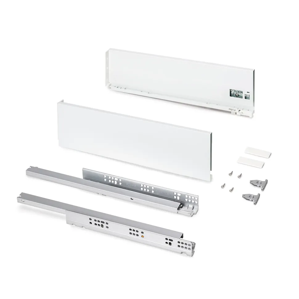 Kit de ferrures nécessaires pour le montage d’un tiroir extérieur de hauteur 131 mm et profondeur 500 mm, n’incluant pas le fond, la façade ni la façade arrière. Contient les coulisses à sortie totale, un jeu de côtés, un jeu de fixations arrière et un jeu de fixations frontales pour tiroir extérieur. Les coulisses, à extraction totale et fermeture amortie, offrent une capacité de charge maximum de 30 kg. U dispose d’un réglage frontal: vertical au moyen d’un excentrique de ±2 mm et horizontal ±1 mm. Fabriquées en acier peint blanc. VOIR LES MESURES DU PRODUIT DANS LES IMAGES. Le tiroir de cuisine et salle de bain Protone est disponible en kit avec toutes les ferrures nécessaires pour le montage et offre une grande capacité de charge, jusqu’à 30 kg par tiroir. Le kit contient les coulisses à sortie totale et fermeture amortie , un jeu de fixations et un jeu de côtés , disponibles en finition blanc ou gris anthracite. Vous n’aurez qu’à ajouter les panneaux pour le fond, la façade arrière et la façade du tiroir, avec les dimensions correctes.