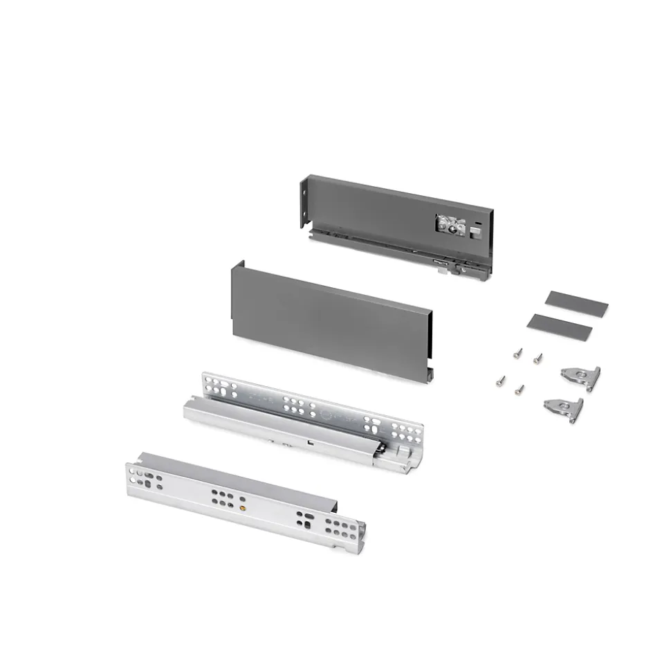 Kit Emuca Protone pour tiroir en applique : coulisses synchronisées à sortie totale avec fermeture amortie, côtés métalliques 93 mm et pièces de fixation incluses. Supporte jusqu’à 30 kg; conception anthracite, montage vissé au caisson, réglages frontal et latéral pour un ajustement précis. Idéal pour cuisines, salles de bains et mobilier sur mesure; panneaux avant/arrière/fond non fournis.