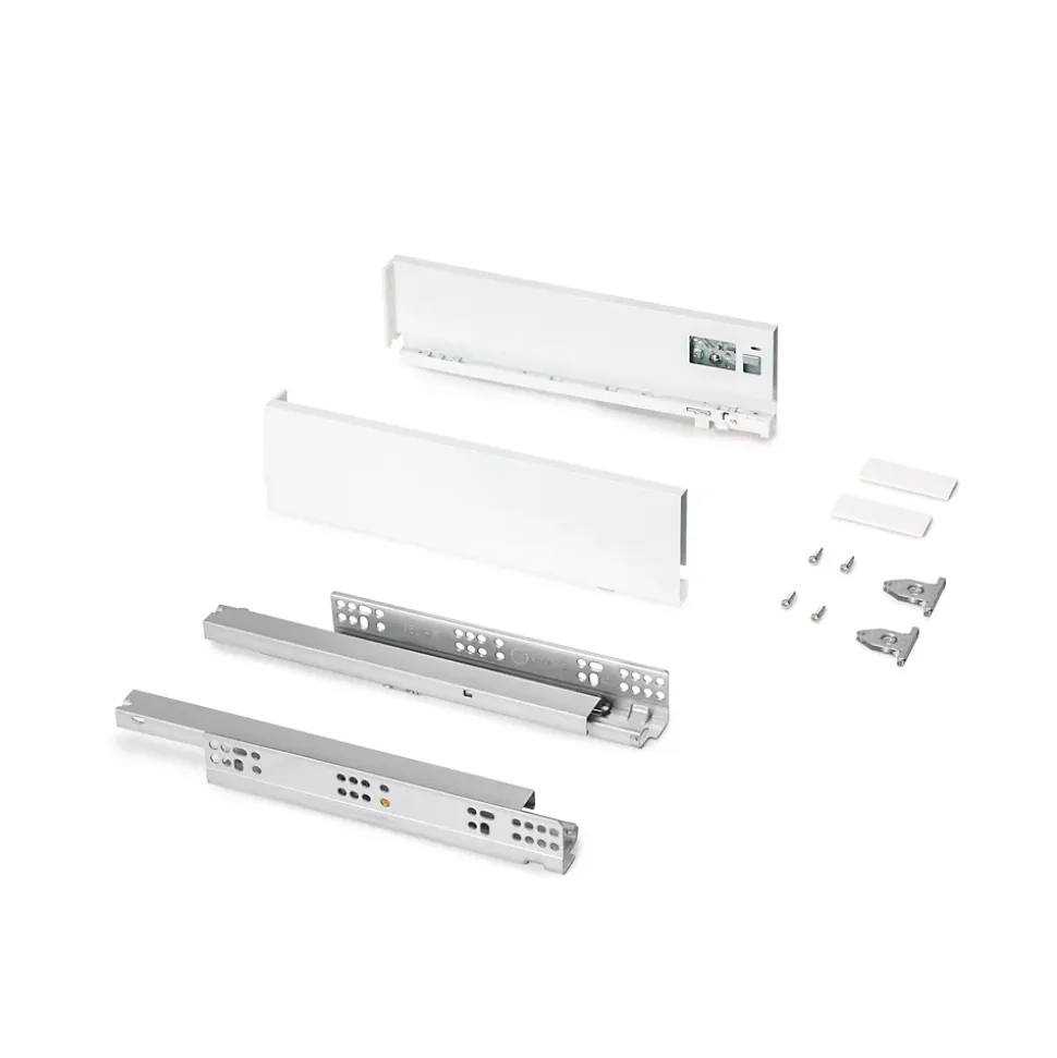 Kit de ferrures nécessaires pour le montage d’un tiroir extérieur de hauteur 93 mm et profondeur 350 mm, n’incluant pas le fond, la façade ni la façade arrière. Contient les coulisses à sortie totale, un jeu de côtés, un jeu de fixations arrière et un jeu de fixations frontales pour tiroir extérieur. Les coulisses, à extraction totale et fermeture amortie, offrent une capacité de charge maximum de 30 kg. U dispose d’un réglage frontal: vertical au moyen d’un excentrique de ±2 mm et horizontal ±1 mm. Fabriquées en acier peint blanc. VOIR LES MESURES DU PRODUIT DANS LES IMAGES. Le tiroir de cuisine et salle de bain Protone est disponible en kit avec toutes les ferrures nécessaires pour le montage et offre une grande capacité de charge, jusqu’à 30 kg par tiroir. Le kit contient les coulisses à sortie totale et fermeture amortie , un jeu de fixations et un jeu de côtés , disponibles en finition blanc ou gris anthracite. Vous n’aurez qu’à ajouter les panneaux pour le fond, la façade arrière et la façade du tiroir, avec les dimensions correctes.
