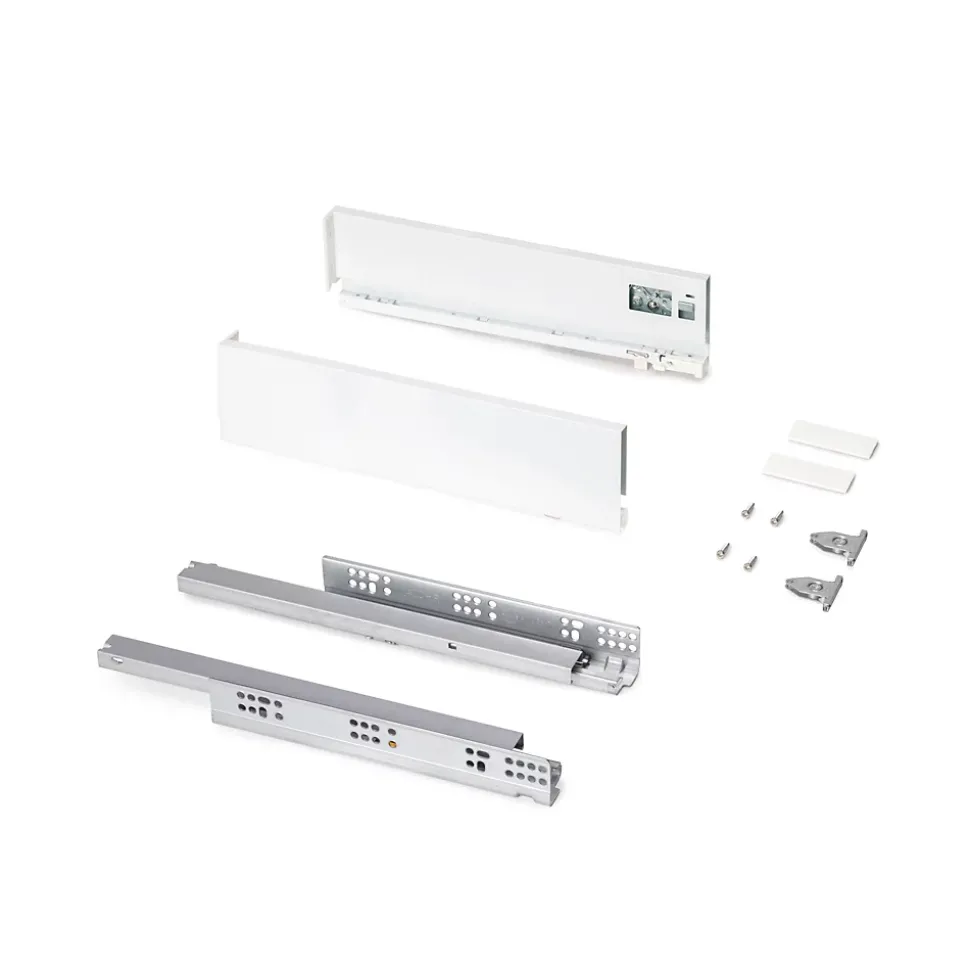 Kit de ferrures nécessaires pour le montage d’un tiroir extérieur de hauteur 93 mm et profondeur 400 mm, n’incluant pas le fond, la façade ni la façade arrière. Contient les coulisses à sortie totale, un jeu de côtés, un jeu de fixations arrière et un jeu de fixations frontales pour tiroir extérieur. Les coulisses, à extraction totale et fermeture amortie, offrent une capacité de charge maximum de 30 kg. U dispose d’un réglage frontal: vertical au moyen d’un excentrique de ±2 mm et horizontal ±1 mm. Fabriquées en acier peint blanc. VOIR LES MESURES DU PRODUIT DANS LES IMAGES. Le tiroir de cuisine et salle de bain Protone est disponible en kit avec toutes les ferrures nécessaires pour le montage et offre une grande capacité de charge, jusqu’à 30 kg par tiroir. Le kit contient les coulisses à sortie totale et fermeture amortie , un jeu de fixations et un jeu de côtés , disponibles en finition blanc ou gris anthracite. Vous n’aurez qu’à ajouter les panneaux pour le fond, la façade arrière et la façade du tiroir, avec les dimensions correctes.