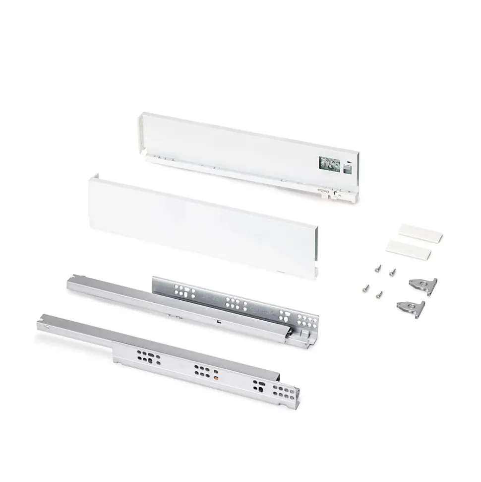 Kit de ferrures nécessaires pour le montage d’un tiroir extérieur de hauteur 93 mm et profondeur 450 mm, n’incluant pas le fond, la façade ni la façade arrière. Contient les coulisses à sortie totale, un jeu de côtés, un jeu de fixations arrière et un jeu de fixations frontales pour tiroir extérieur. Les coulisses, à extraction totale et fermeture amortie, offrent une capacité de charge maximum de 30 kg. U dispose d’un réglage frontal: vertical au moyen d’un excentrique de ±2 mm et horizontal ±1 mm. Fabriquées en acier peint blanc. VOIR LES MESURES DU PRODUIT DANS LES IMAGES. Le tiroir de cuisine et salle de bain Protone est disponible en kit avec toutes les ferrures nécessaires pour le montage et offre une grande capacité de charge, jusqu’à 30 kg par tiroir. Le kit contient les coulisses à sortie totale et fermeture amortie , un jeu de fixations et un jeu de côtés , disponibles en finition blanc ou gris anthracite. Vous n’aurez qu’à ajouter les panneaux pour le fond, la façade arrière et la façade du tiroir, avec les dimensions correctes.