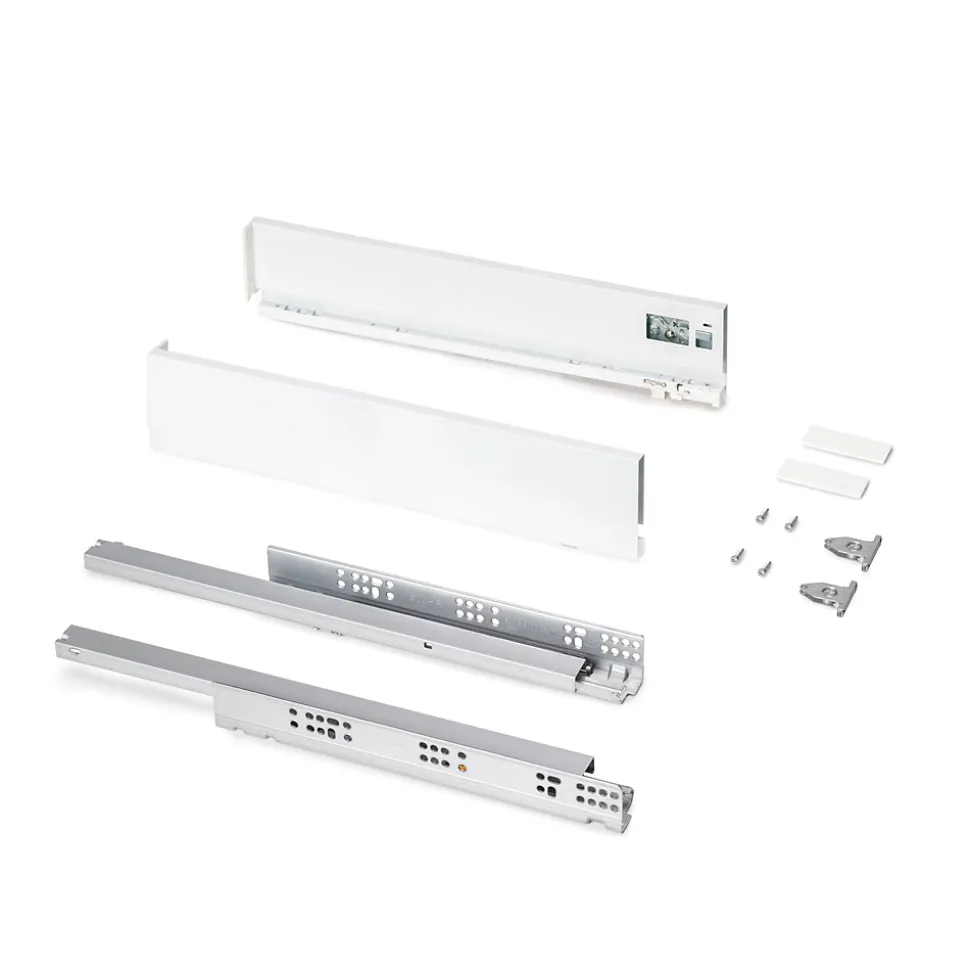 Kit de ferrures nécessaires pour le montage d’un tiroir extérieur de hauteur 93 mm et profondeur 500 mm, n’incluant pas le fond, la façade ni la façade arrière. Contient les coulisses à sortie totale, un jeu de côtés, un jeu de fixations arrière et un jeu de fixations frontales pour tiroir extérieur. Les coulisses, à extraction totale et fermeture amortie, offrent une capacité de charge maximum de 30 kg. U dispose d’un réglage frontal: vertical au moyen d’un excentrique de ±2 mm et horizontal ±1 mm. Fabriquées en acier peint blanc. VOIR LES MESURES DU PRODUIT DANS LES IMAGES. Le tiroir de cuisine et salle de bain Protone est disponible en kit avec toutes les ferrures nécessaires pour le montage et offre une grande capacité de charge, jusqu’à 30 kg par tiroir. Le kit contient les coulisses à sortie totale et fermeture amortie , un jeu de fixations et un jeu de côtés , disponibles en finition blanc ou gris anthracite. Vous n’aurez qu’à ajouter les panneaux pour le fond, la façade arrière et la façade du tiroir, avec les dimensions correctes.