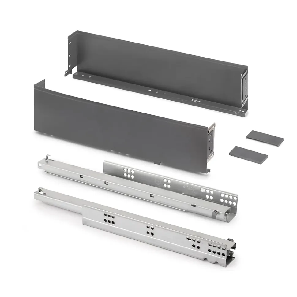 Le tiroir Simplex avec côtés métalliques est idéal pour les meubles de cuisine, salle de bain et maison, sans nécessiter d’usinage spécial.Il a une hauteur de 122 mm avec un design élégant, pour tiroirs d’une profondeur de 440 mm, offrant un grand volume intérieur et une finition moderne.Permet le réglage de la façade de ±2 mm en vertical grâce à une excentrique et ±1,5 mm en horizontal, avec réglage en hauteur grâce aux coulisses Silver L à extraction totale et fermeture amortie.Offre une capacité de charge de 25 kg, garantissant résistance et fluidité dans le mouvement.Fabriqué en acier avec une finition gris anthracite. VOIR LES MESURES DU PRODUIT DANS LES IMAGES. Le tiroir Simplex avec côtés métalliques est la solution la plus simple et la plus polyvalente pour disposer d’un tiroir à côtés métalliques dans des meubles de cuisine, salle de bain ou maison, sans nécessiter d’usinage spécial.Avec un design élégant et une hauteur de 122 mm, il offre un grand volume intérieur et une finition moderne. Son système permet le réglage de la façade du tiroir de ±2 mm en vertical grâce à une excentrique et de ±1,5 mm en horizontal. Il intègre également la coulisse Silver L à extraction totale, avec fermeture amortie et une capacité de charge de 25 kg, garantissant un mouvement fluide et stable.Le kit comprend deux côtés latéraux, un jeu de caches frontaux, un jeu de coulisses et les vis pour fixer le panneau avant. Il est fabriqué en acier avec une finition peinte gris anthracite ou blanc.