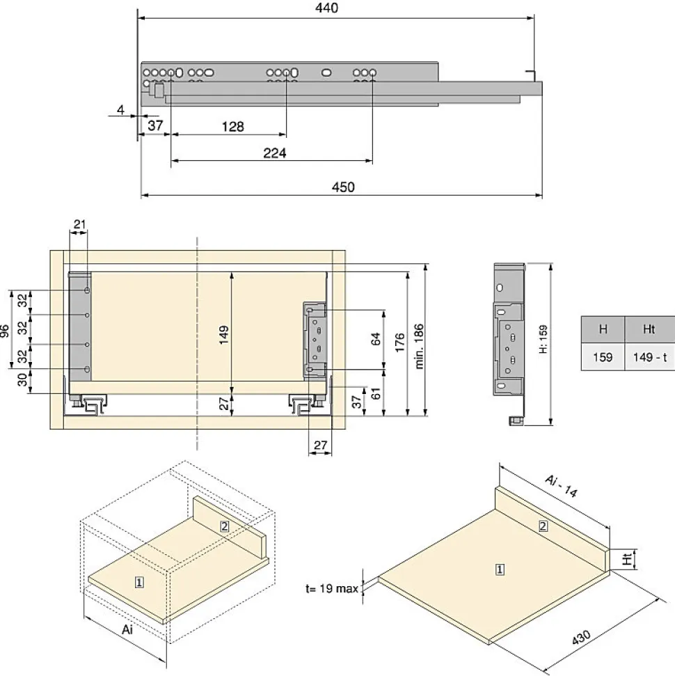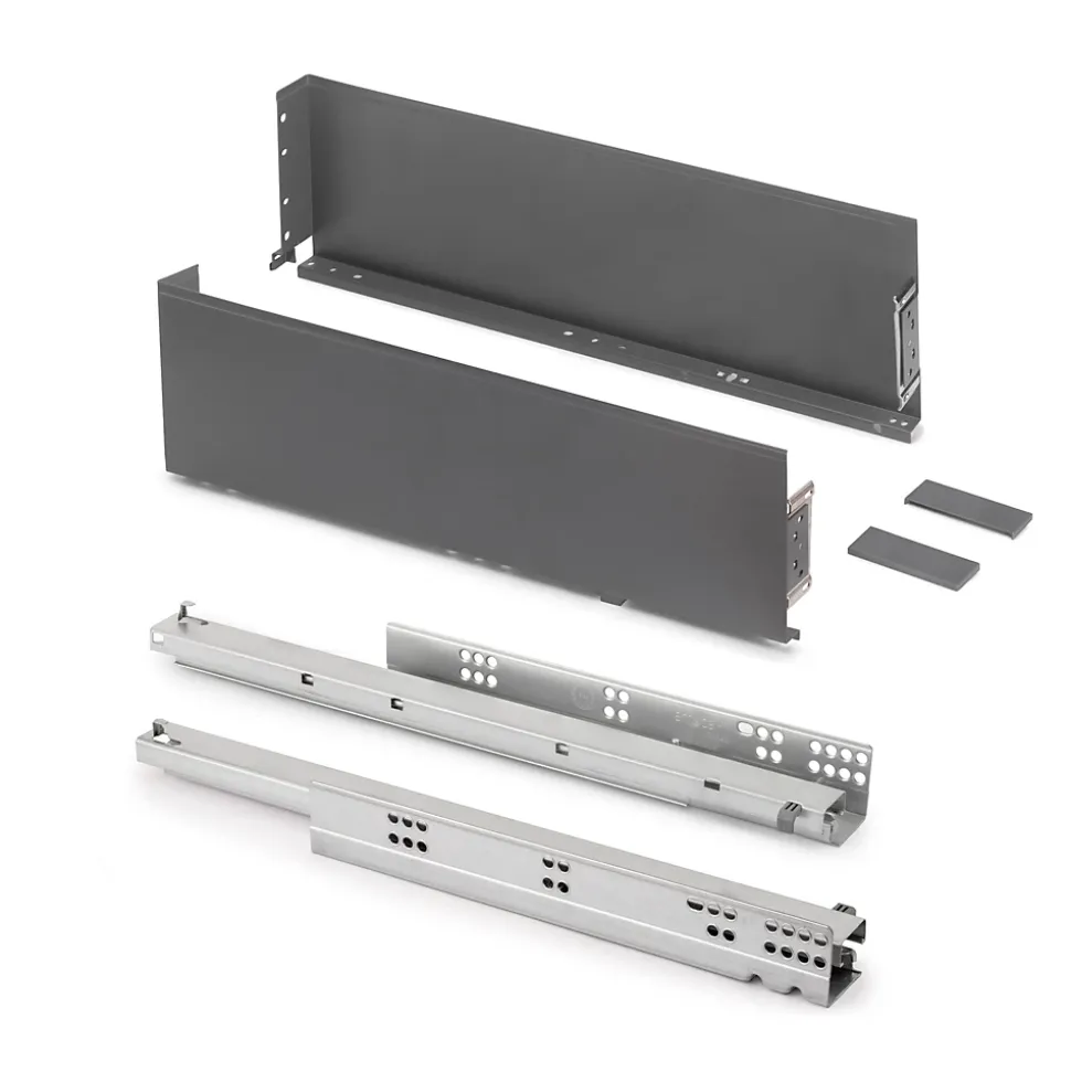 Le tiroir Simplex avec côtés métalliques est idéal pour les meubles de cuisine, salle de bain et maison, sans nécessiter d’usinage spécial.Il a une hauteur de 159 mm avec un design élégant, pour tiroirs d’une profondeur de 440 mm, offrant un grand volume intérieur et une finition moderne.Permet le réglage de la façade de ±2 mm en vertical grâce à une excentrique et ±1,5 mm en horizontal, avec réglage en hauteur grâce aux coulisses Silver L à extraction totale et fermeture amortie.Offre une capacité de charge de 25 kg, garantissant résistance et fluidité dans le mouvement.Fabriqué en acier avec une finition gris anthracite. VOIR LES MESURES DU PRODUIT DANS LES IMAGES. Le tiroir Simplex avec côtés métalliques est la solution la plus simple et la plus polyvalente pour disposer d’un tiroir à côtés métalliques dans des meubles de cuisine, salle de bain ou maison, sans nécessiter d’usinage spécial.Avec un design élégant et une hauteur de 159 mm, il offre un grand volume intérieur et une finition moderne. Son système permet le réglage de la façade du tiroir de ±2 mm en vertical grâce à une excentrique et de ±1,5 mm en horizontal. Il intègre également la coulisse Silver L à extraction totale, avec fermeture amortie et une capacité de charge de 25 kg, garantissant un mouvement fluide et stable.Le kit comprend deux côtés latéraux, un jeu de caches frontaux, un jeu de coulisses et les vis pour fixer le panneau avant. Il est fabriqué en acier avec une finition peinte gris anthracite ou blanc.