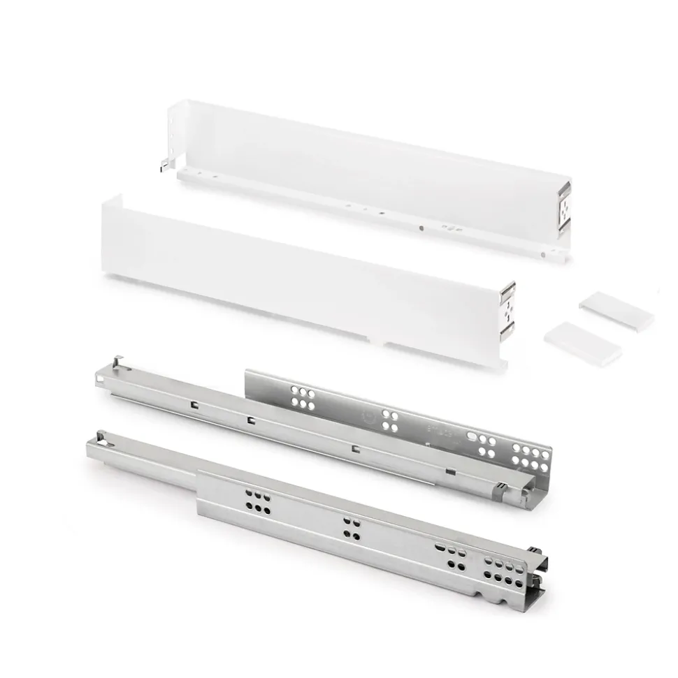 Le tiroir Simplex avec côtés métalliques est idéal pour les meubles de cuisine, salle de bain et maison, sans nécessiter d’usinage spécial.Il a une hauteur de 88 mm avec un design élégant, pour tiroirs d’une profondeur de 440 mm, offrant un grand volume intérieur et une finition moderne.Permet le réglage de la façade de ±2 mm en vertical grâce à une excentrique et ±1,5 mm en horizontal, avec réglage en hauteur grâce aux coulisses Silver L à extraction totale et fermeture amortie.Offre une capacité de charge de 25 kg, garantissant résistance et fluidité dans le mouvement.Fabriqué en acier avec une finition blanche laquée. VOIR LES MESURES DU PRODUIT DANS LES IMAGES. Le tiroir Simplex avec côtés métalliques est la solution la plus simple et la plus polyvalente pour disposer d’un tiroir à côtés métalliques dans des meubles de cuisine, salle de bain ou maison, sans nécessiter d’usinage spécial.Avec un design élégant et une hauteur de 88 mm, il offre un grand volume intérieur et une finition moderne. Son système permet le réglage de la façade du tiroir de ±2 mm en vertical grâce à une excentrique et de ±1,5 mm en horizontal. Il intègre également la coulisse Silver L à extraction totale, avec fermeture amortie et une capacité de charge de 25 kg, garantissant un mouvement fluide et stable.Le kit comprend deux côtés latéraux, un jeu de caches frontaux, un jeu de coulisses et les vis pour fixer le panneau avant. Il est fabriqué en acier avec une finition peinte gris anthracite ou blanc.