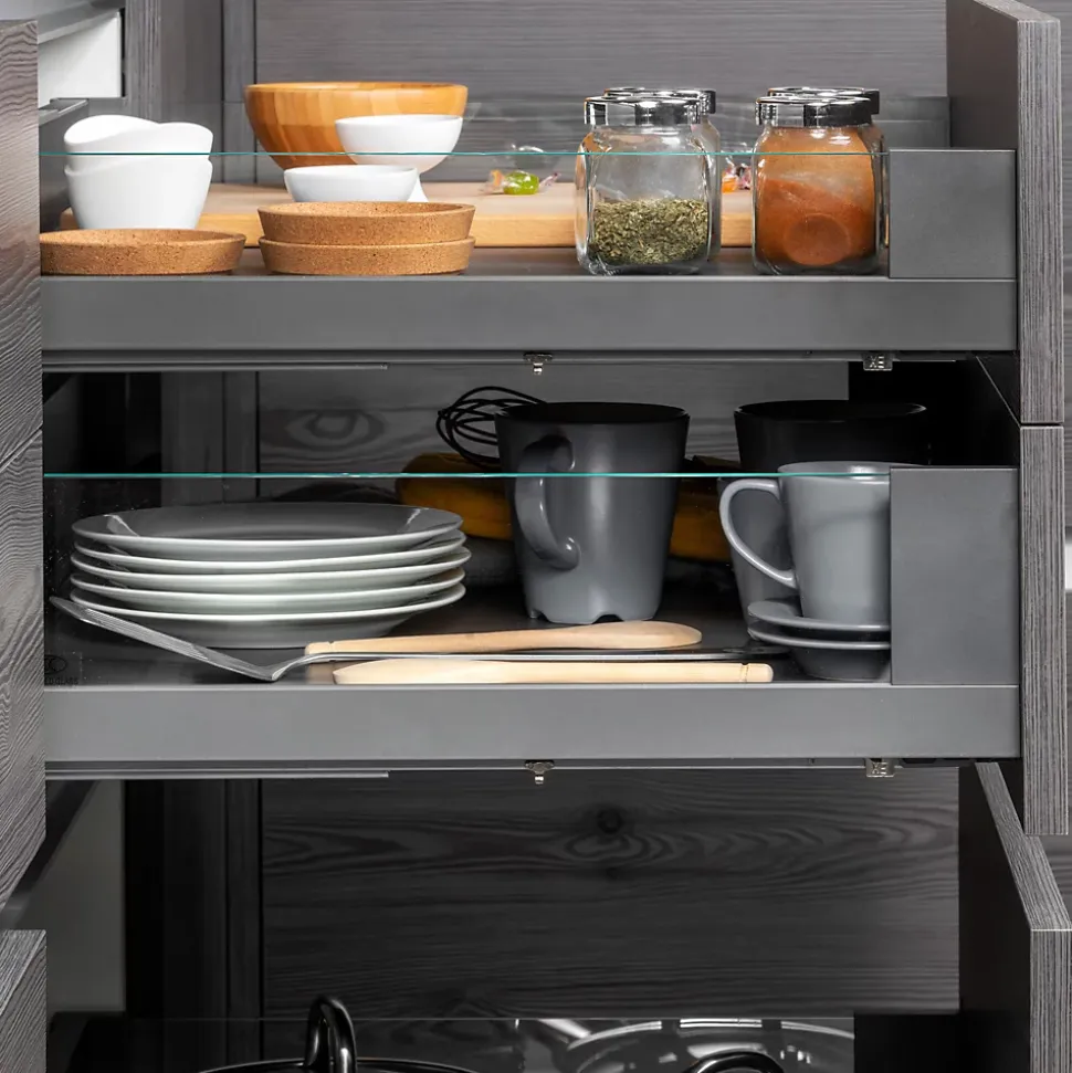 - Glissières synchronisées à sortie totale avec fermeture amortie pour un refermement silencieux et doux.