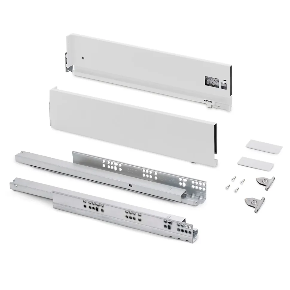 Kit de ferrures nécessaires pour le montage d’un tiroir extérieur de hauteur 131 mm et profondeur 400 mm, n’incluant pas le fond, la façade ni la façade arrière.Dimensionnées pour une épaisseur de panneau de 16 mm pour le fond et l’arrière du tiroir.Coulisses à sortie totale synchronisés, avec fermeture amortie et charge jusqu’à 40 kg.U dispose d’un réglage frontal en 3D : vertical au moyen d’un excentrique de ±2 mm, horizontal ±1 mm, inclinaison -1,5/+4 mm.Fabriquées en acier peint blanc. VOIR LES MESURES DU PRODUIT DANS LES IMAGES. Kit pour tiroir de cuisine et salle de bain Vertex avec tous les éléments nécessaires à son montage. C’est la solution optimale pour vos meubles de cuisine, de salle de bain ou d’armoire avec un design élégant. Chaque kit est composé de tous les éléments nécessaires au montage d’un tiroir extérieur de hauteur 131mm, dimensionnées pour une épaisseur de panneau de 16mm pour le fond et l’arrière du tiroir. Comprend: deux côtés latérales, un ensemble de guides à fermeture amortie, un ensemble de couvre-garnitures et des attaches avant de tiroir.Les côtés latérales métalliques sont en acier avec finition peinte en gris anthracite, permettent d’un réglage frontal en 3D : vertical au moyen d’un excentrique de ±2 mm, horizontal ±1 mm, inclinaison -1,5/+4 mm. Les guides sont à sortie totale avec fermeture amortie et permettent une charge maximale de 40 Kg pour le tiroir.Vous n’aurez qu’à ajouter les panneaux pour le fond, la façade arrière et la façade du tiroir, avec les dimensions correctes.