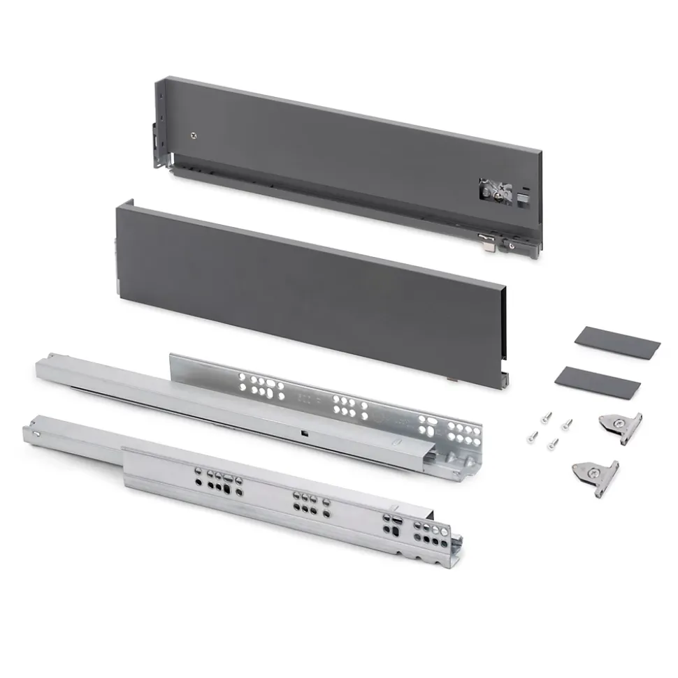 Kit de ferrures nécessaires pour le montage d’un tiroir extérieur de hauteur 131 mm et profondeur 500 mm, n’incluant pas le fond, la façade ni la façade arrière.Dimensionnées pour une épaisseur de panneau de 16 mm pour le fond et l’arrière du tiroir.Coulisses à sortie totale synchronisés, avec fermeture amortie et charge jusqu’à 40 kg.U dispose d’un réglage frontal en 3D : vertical au moyen d’un excentrique de ±2 mm, horizontal ±1 mm, inclinaison -1,5/+4 mm.Fabriquée en acier peint gris anthracite. VOIR LES MESURES DU PRODUIT DANS LES IMAGES. Kit pour tiroir de cuisine et salle de bain Vertex avec tous les éléments nécessaires à son montage. C’est la solution optimale pour vos meubles de cuisine, de salle de bain ou d’armoire avec un design élégant. Chaque kit est composé de tous les éléments nécessaires au montage d’un tiroir extérieur de hauteur 131mm, dimensionnées pour une épaisseur de panneau de 16mm pour le fond et l’arrière du tiroir. Comprend: deux côtés latérales, un ensemble de guides à fermeture amortie, un ensemble de couvre-garnitures et des attaches avant de tiroir.Les côtés latérales métalliques sont en acier avec finition peinte en gris anthracite, permettent d’un réglage frontal en 3D : vertical au moyen d’un excentrique de ±2 mm, horizontal ±1 mm, inclinaison -1,5/+4 mm. Les guides sont à sortie totale avec fermeture amortie et permettent une charge maximale de 40 Kg pour le tiroir.Vous n’aurez qu’à ajouter les panneaux pour le fond, la façade arrière et la façade du tiroir, avec les dimensions correctes.