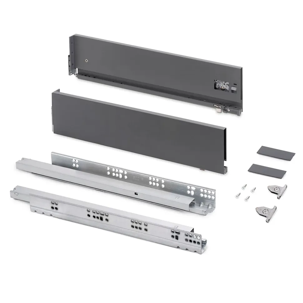 Kit de ferrures nécessaires pour le montage d’un tiroir extérieur de hauteur 131 mm et profondeur 500 mm, n’incluant pas le fond, la façade ni la façade arrière.Dimensionnées pour une épaisseur de panneau de 16 mm pour le fond et l’arrière du tiroir.Coulisses à sortie totale synchronisés, avec fermeture amortie et charge jusqu’à 60 kg.U dispose d’un réglage frontal en 3D : vertical au moyen d’un excentrique de ±2 mm, horizontal ±1 mm, inclinaison -1,5/+4 mm.Fabriquée en acier peint gris anthracite. VOIR LES MESURES DU PRODUIT DANS LES IMAGES. Kit pour tiroir de cuisine et salle de bain Vertex avec tous les éléments nécessaires à son montage. C’est la solution optimale pour vos meubles de cuisine, de salle de bain ou d’armoire avec un design élégant. Chaque kit est composé de tous les éléments nécessaires au montage d’un tiroir extérieur de hauteur 131mm, dimensionnées pour une épaisseur de panneau de 16mm pour le fond et l’arrière du tiroir. Comprend: deux côtés latérales, un ensemble de guides à fermeture amortie, un ensemble de couvre-garnitures et des attaches avant de tiroir.Les côtés latérales métalliques sont en acier avec finition peinte en gris anthracite, permettent d’un réglage frontal en 3D : vertical au moyen d’un excentrique de ±2 mm, horizontal ±1 mm, inclinaison -1,5/+4 mm. Les guides sont à sortie totale avec fermeture amortie et permettent une charge maximale de 60kg pour le tiroir.Vous n’aurez qu’à ajouter les panneaux pour le fond, la façade arrière et la façade du tiroir, avec les dimensions correctes.