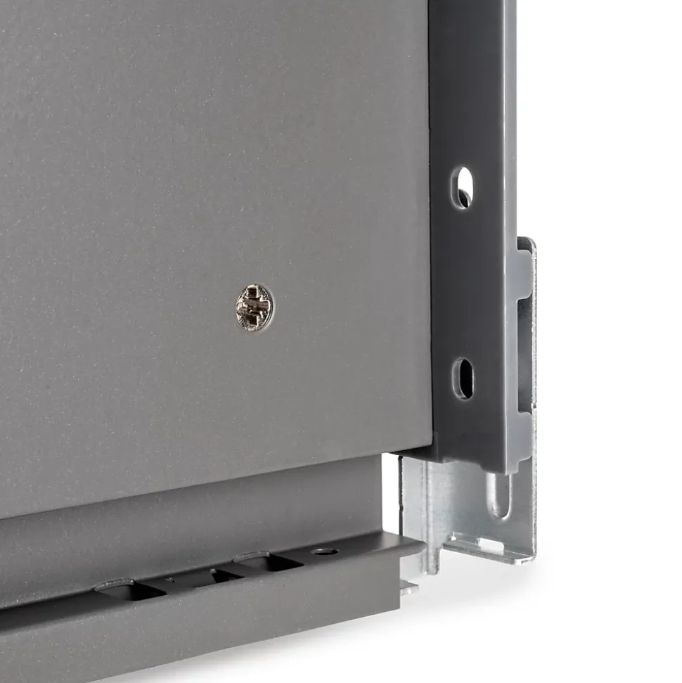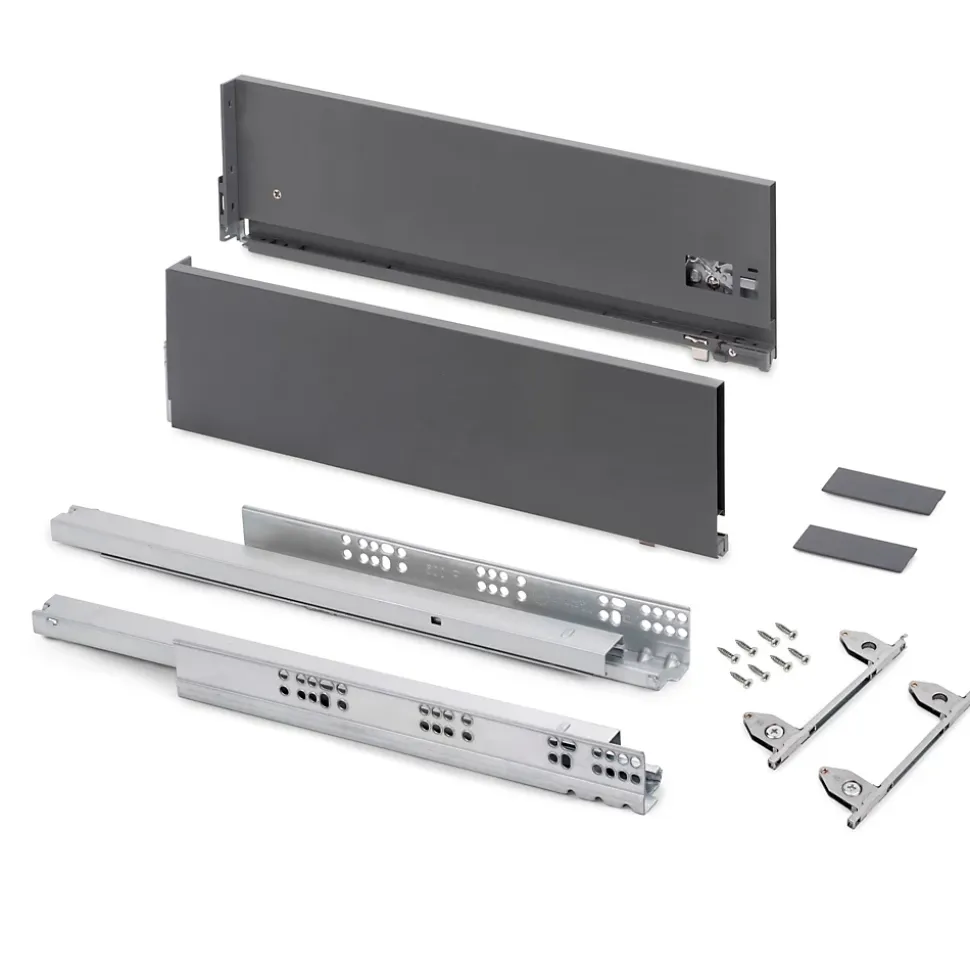 Kit pour tiroir de cuisine et salle de bain Vertex avec tous les éléments nécessaires au montage. Comprend deux côtés latéraux, guides à fermeture amortie, couvre-garnitures et attaches avant. Compatible avec panneaux de 18 mm d’épaisseur. Charge maximale 40 kg, réglages 3D précis, finition peinture gris anthracite.