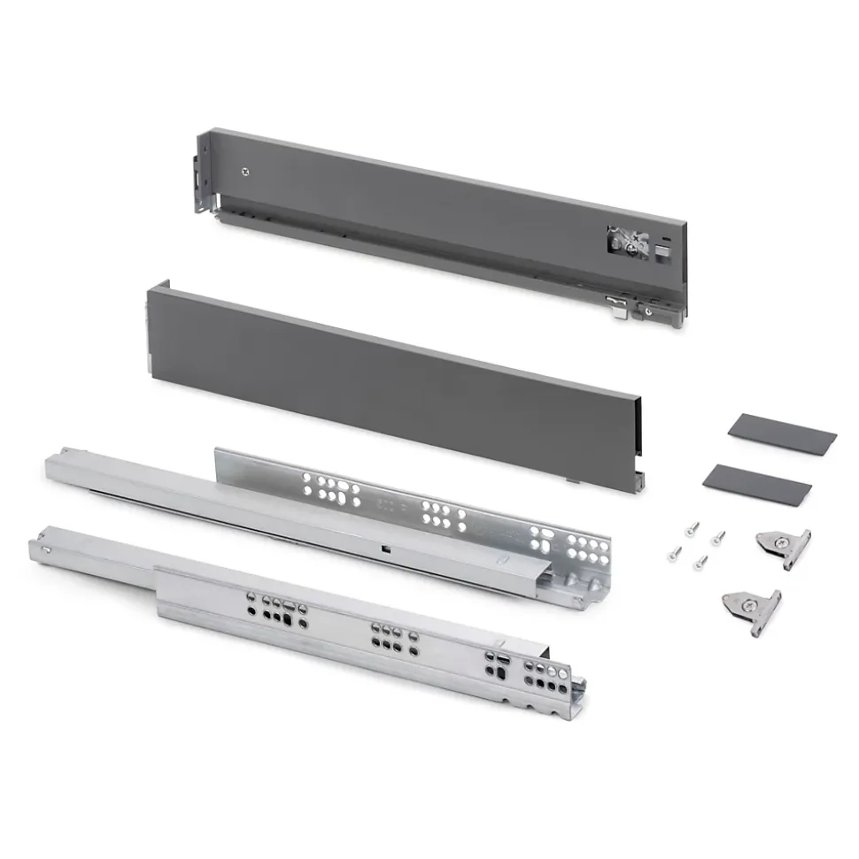 Kit de ferrures nécessaires pour le montage d’un tiroir extérieur de hauteur 83 mm et profondeur 500 mm, n’incluant pas le fond, la façade ni la façade arrière.Dimensionnées pour une épaisseur de panneau de 16 mm pour le fond et l’arrière du tiroir.Coulisses à sortie totale synchronisés, avec fermeture amortie et charge jusqu’à 40 kg.U dispose d’un réglage frontal en 3D : vertical au moyen d’un excentrique de ±2 mm, horizontal ±1 mm, inclinaison -1,5/+4 mm.Fabriquée en acier peint gris anthracite. VOIR LES MESURES DU PRODUIT DANS LES IMAGES. Kit pour tiroir de cuisine et salle de bain Vertex avec tous les éléments nécessaires à son montage. C’est la solution optimale pour vos meubles de cuisine, de salle de bain ou d’armoire avec un design élégant. Chaque kit est composé de tous les éléments nécessaires au montage d’un tiroir extérieur de hauteur 83mm, dimensionnées pour une épaisseur de panneau de 16mm pour le fond et l’arrière du tiroir. Comprend: deux côtés latérales, un ensemble de guides à fermeture amortie, un ensemble de couvre-garnitures et des attaches avant de tiroir.Les côtés latérales métalliques sont en acier avec finition peinte en gris anthracite, permettent d’un réglage frontal en 3D : vertical au moyen d’un excentrique de ±2 mm, horizontal ±1 mm, inclinaison -1,5/+4 mm. Les guides sont à sortie totale avec fermeture amortie et permettent une charge maximale de 40 Kg pour le tiroir.Vous n’aurez qu’à ajouter les panneaux pour le fond, la façade arrière et la façade du tiroir, avec les dimensions correctes.